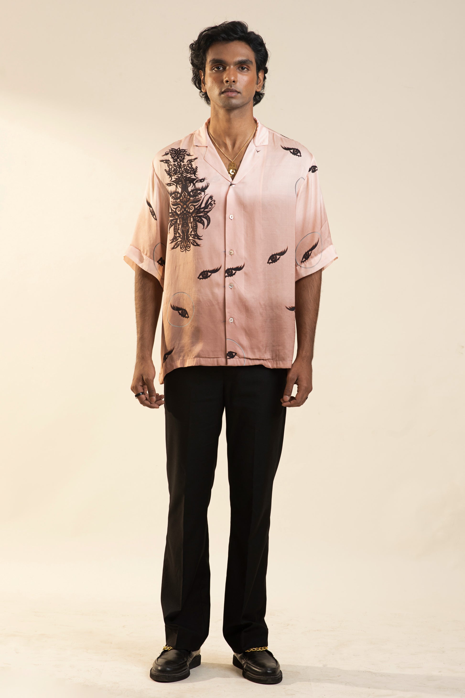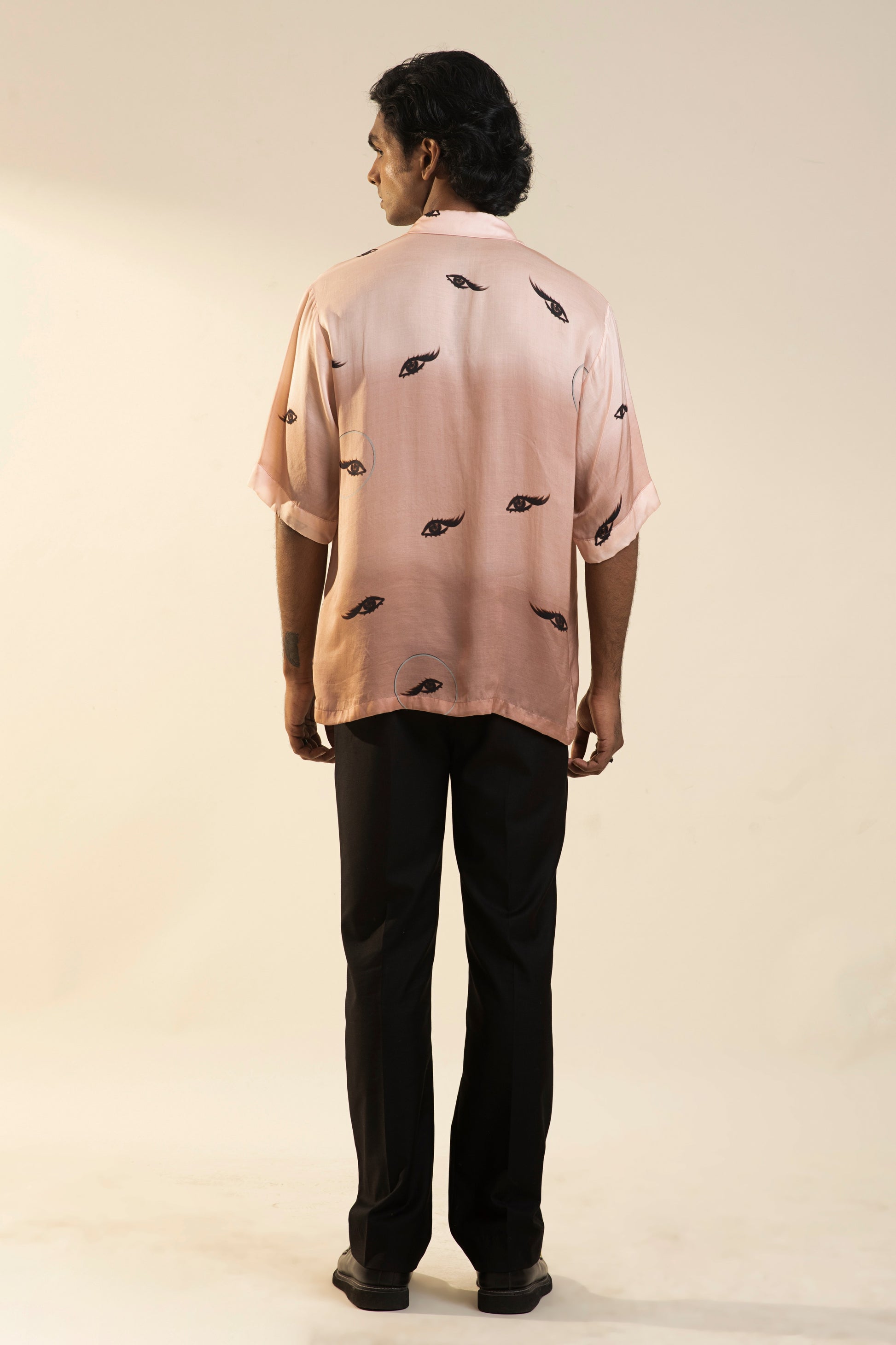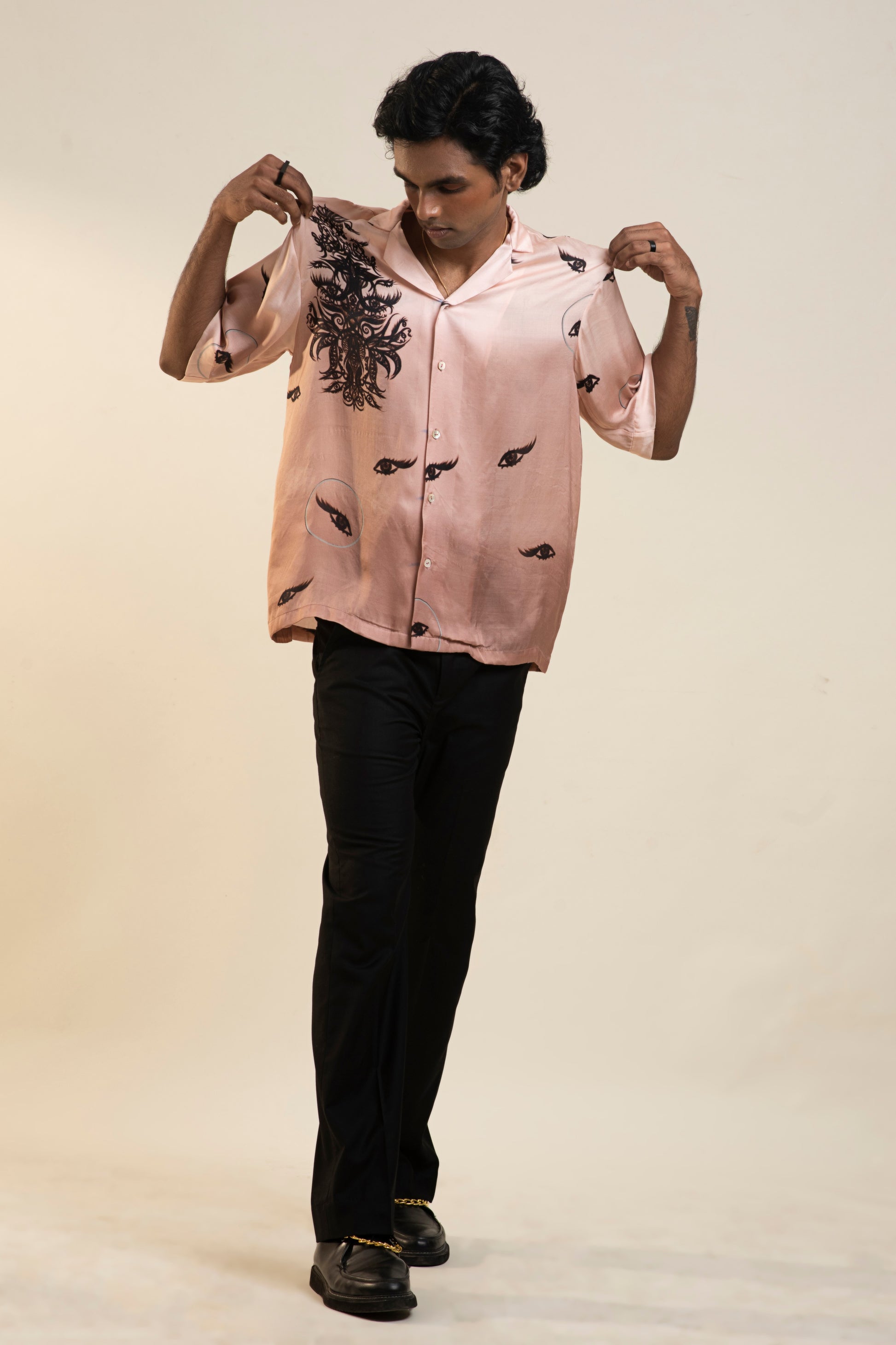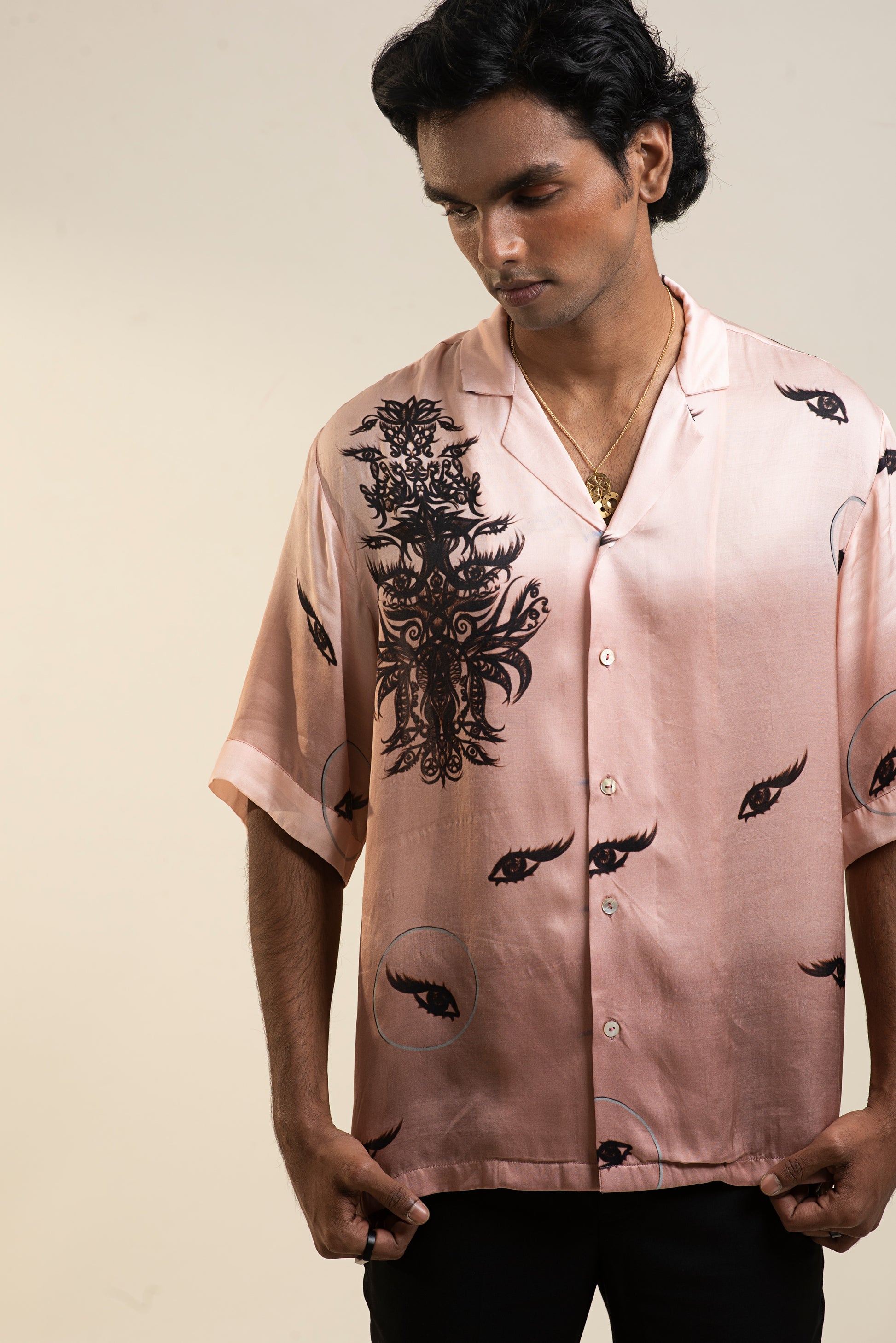 A digitally printed graded Pale Pink shirt on Modal Satin with a relaxed fit, camp collar, half sleeves, and shell buttons adorned with sketchy eyes artwork sounds incredibly stylish and attention-grabbing! It’s a perfect blend of comfort and unique design elements, sure to make a statement wherever it’s worn.