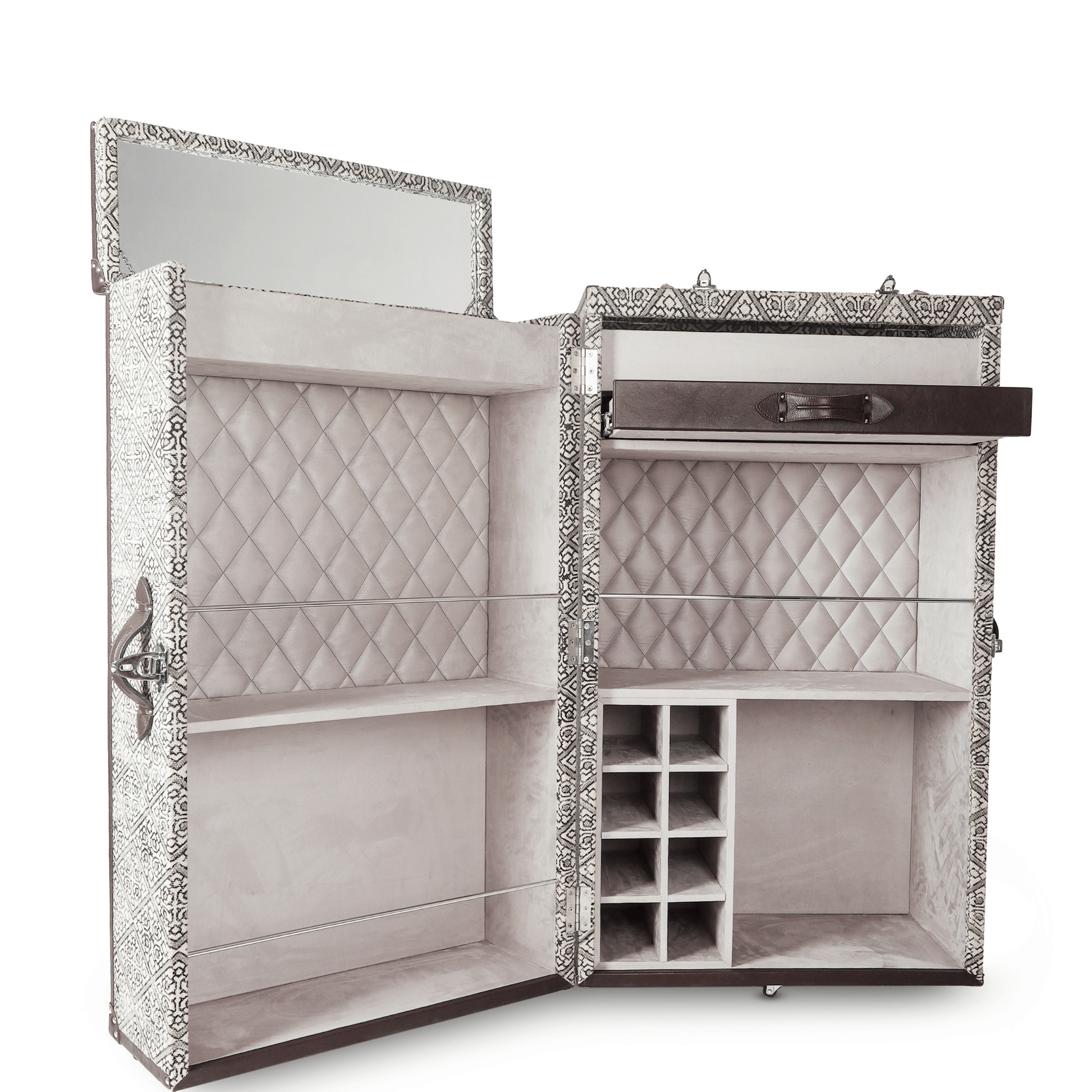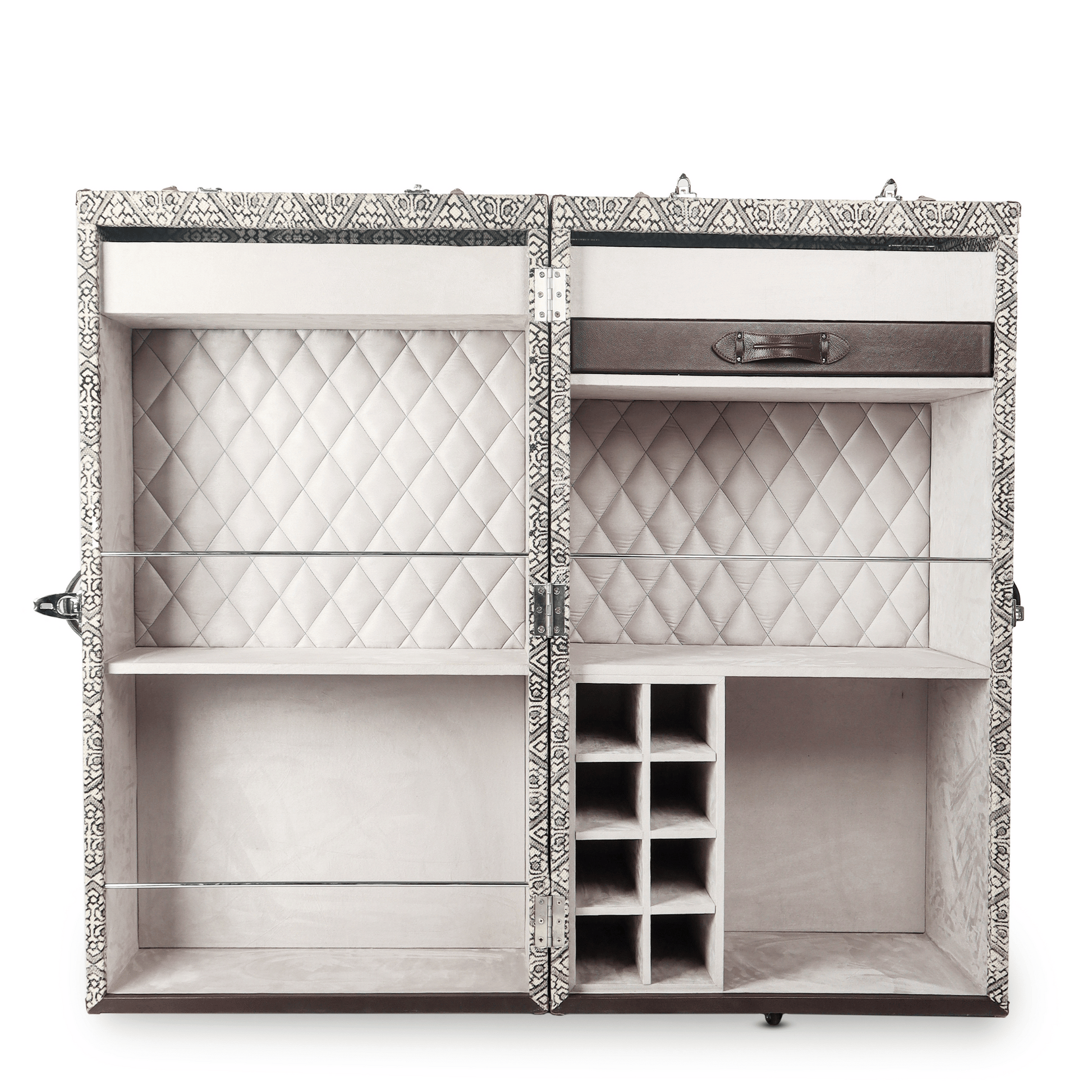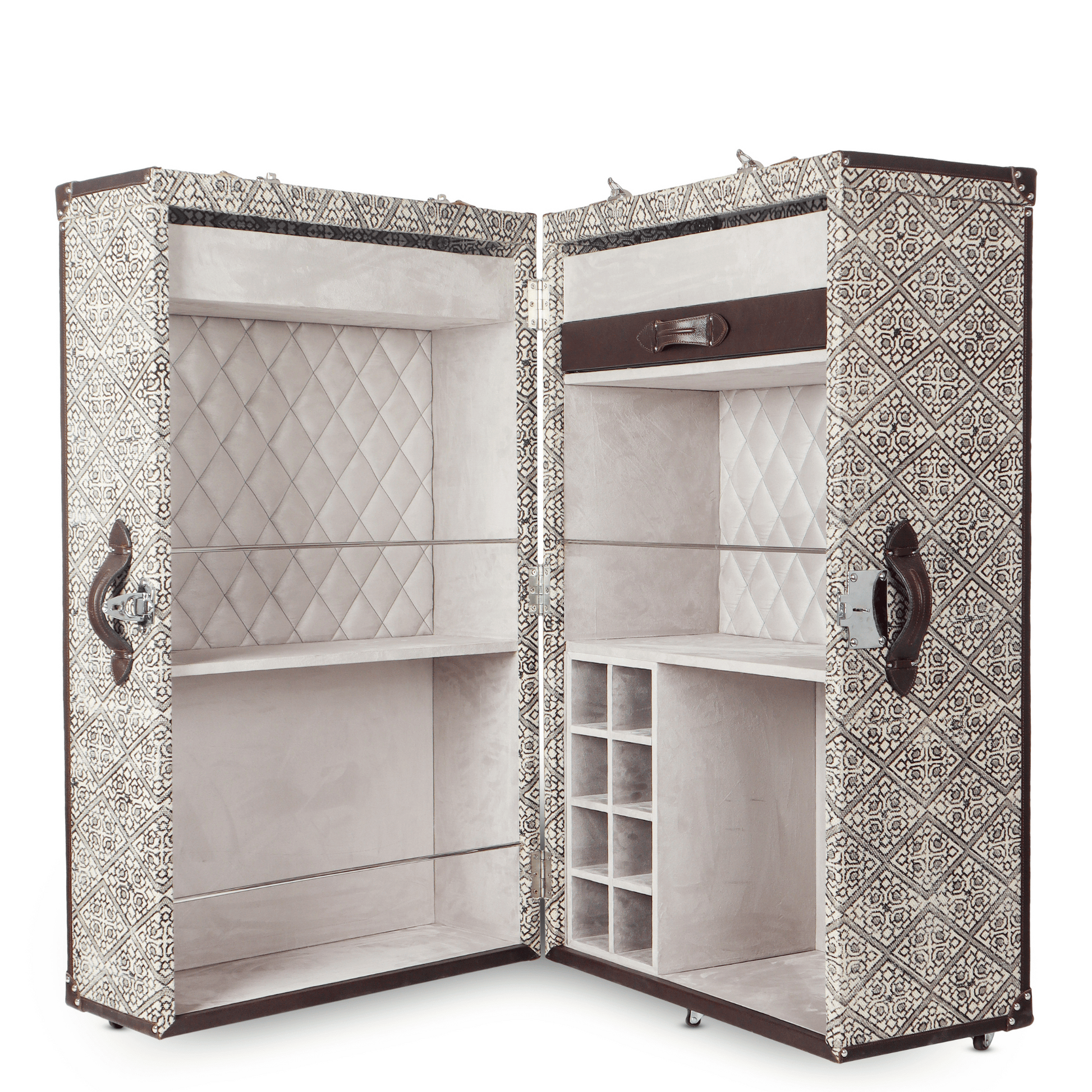 This eye-catching handcrafted cabinet will hold all that your bar needs and is ideal for entertaining at home. The beautiful leather exterior is accentuated with classic belt details and the doors open up to display a spacious suede-lined interior that is organized for easy access. The cabinet is mounted on reinforced sturdy wheels that allow easy movement. Enjoy the experience of entertaining at home, with this one-of-a-kind, statement-making piece of design and craftsmanship.