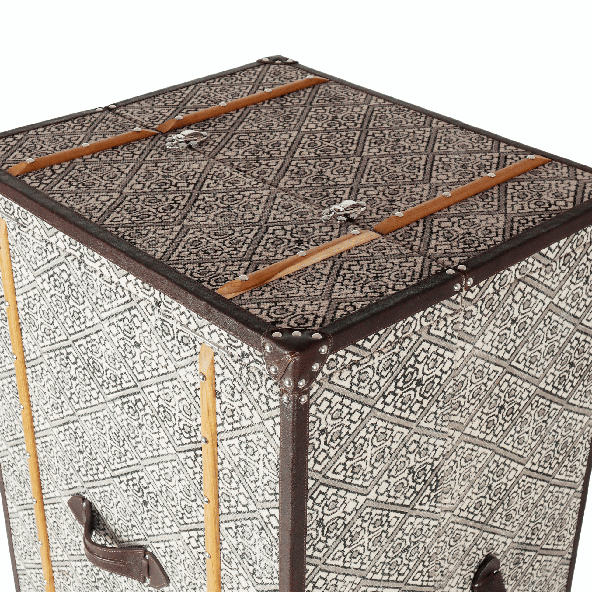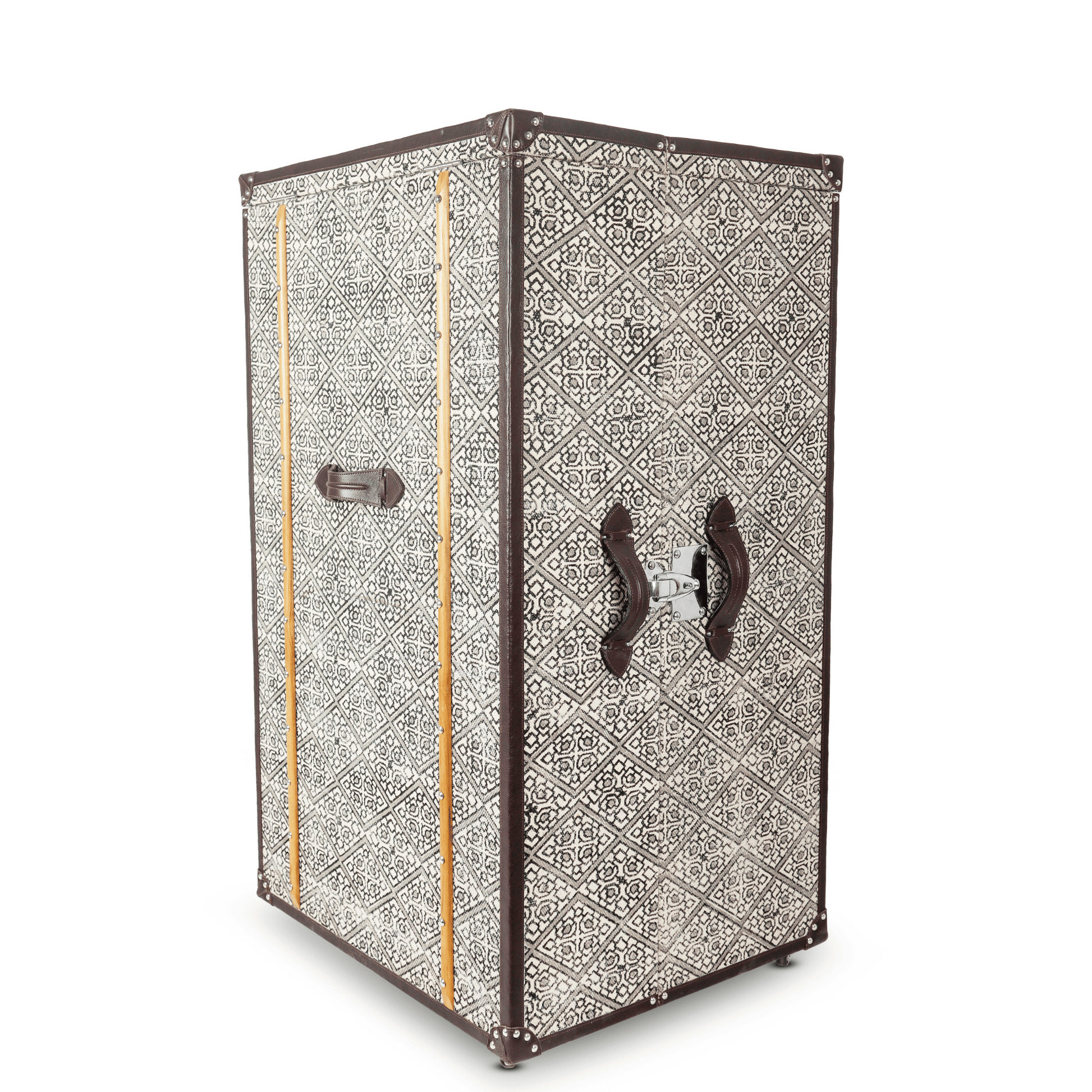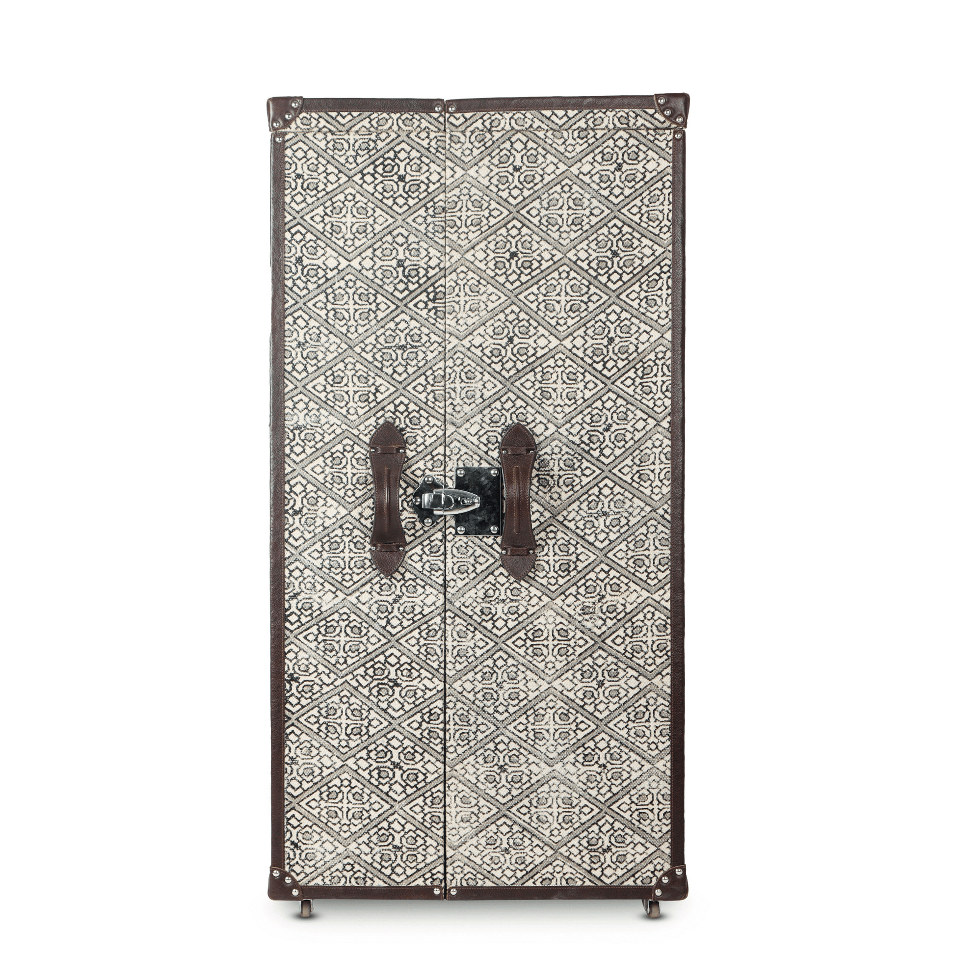 This eye-catching handcrafted cabinet will hold all that your bar needs and is ideal for entertaining at home. The beautiful leather exterior is accentuated with classic belt details and the doors open up to display a spacious suede-lined interior that is organized for easy access. The cabinet is mounted on reinforced sturdy wheels that allow easy movement. Enjoy the experience of entertaining at home, with this one-of-a-kind, statement-making piece of design and craftsmanship.