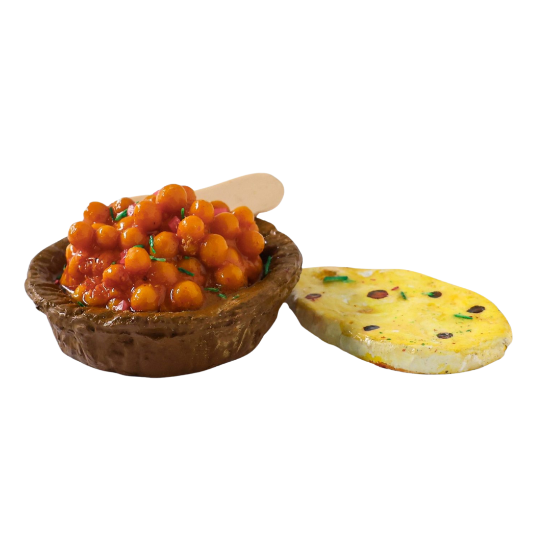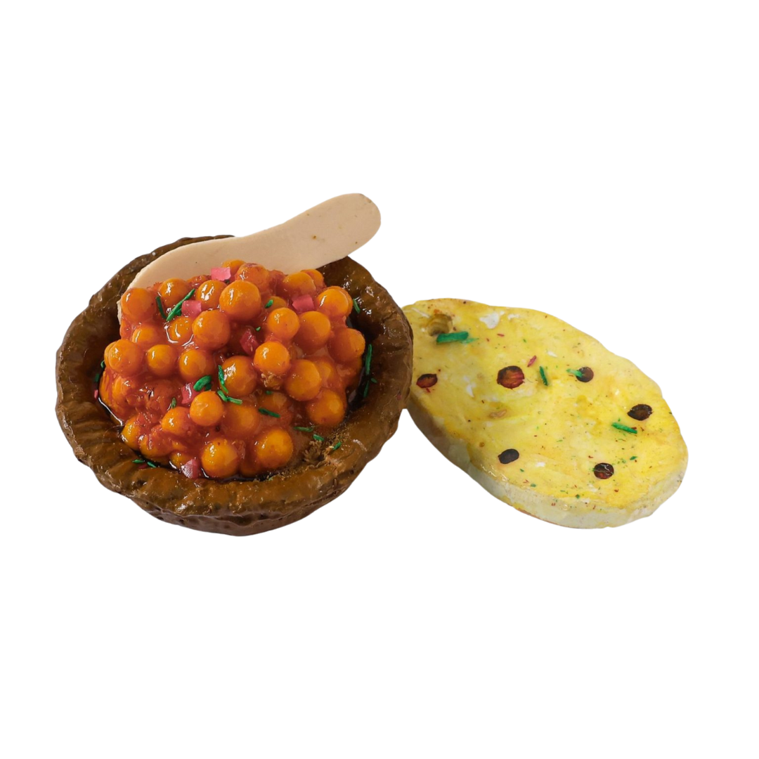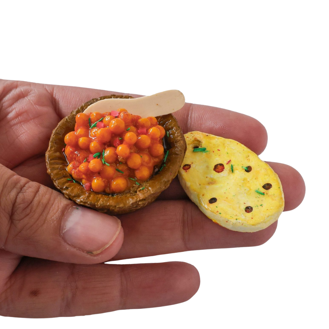 Chole with Kulcha, a hearty and fulfilling dish that harmonises spicy chickpeas with fluffy, oven-baked bread. This timeless pairing is a cornerstone of North Indian cuisine, cherished for its bold flavours and comforting essence. Our Chole with Kulcha Miniature Fridge Magnet pays homage to this culinary masterpiece, encapsulating its essence in miniature form. Each tiny kulcha and bowl of chole is meticulously handcrafted to evoke the aroma and taste of this beloved meal. Perfect for infusing your space with the richness of Indian culinary tradition or gifting to aficionados who savour authentic flavours. Elevate your surroundings with the savoury delight of our Handcrafted Chole with Kulcha Miniature Fridge Magnet.