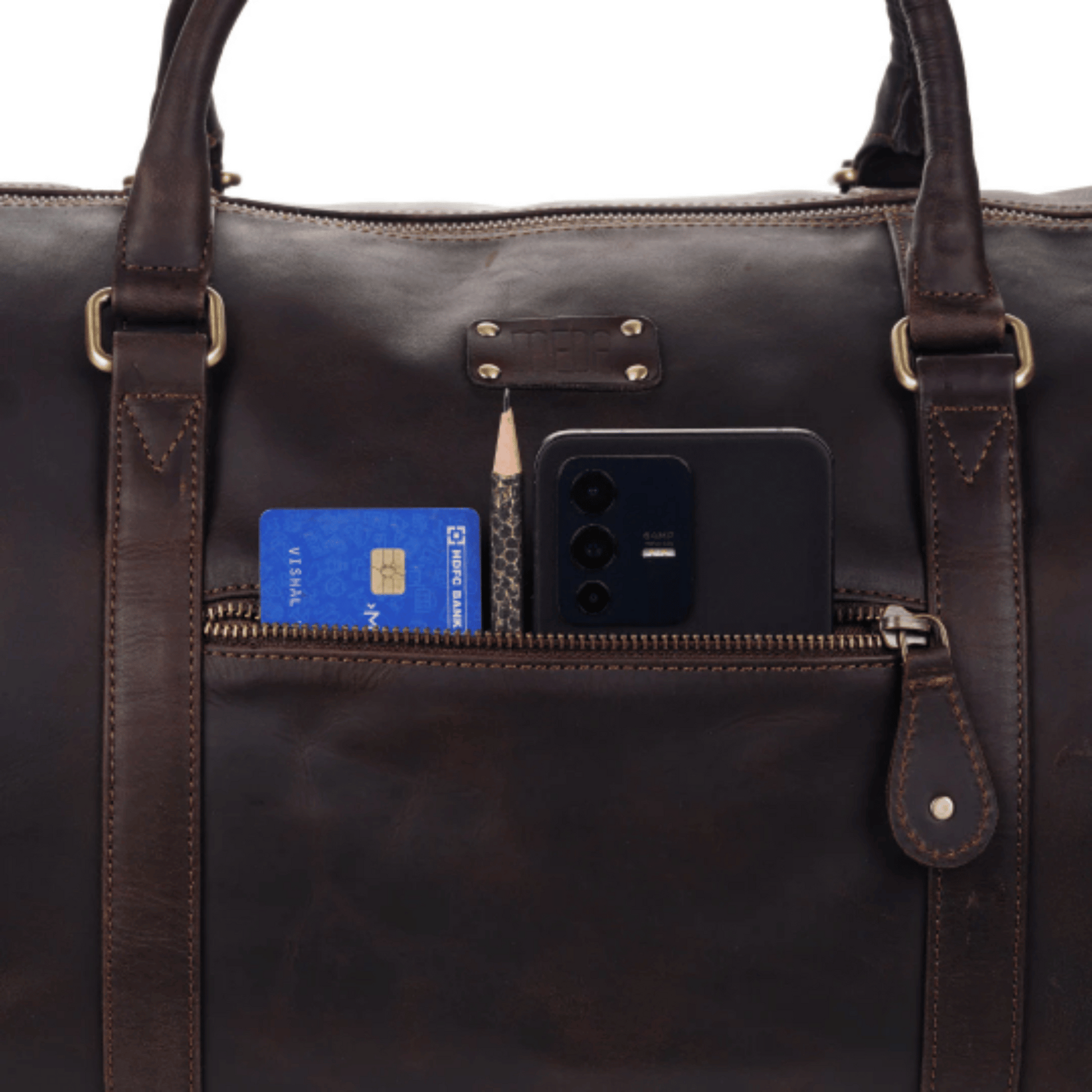 The spacious main compartment enclosed with metal zipper is perfect for weekend getaways or daily use, accommodating all your essentials with ease. An external small zipper pocket provides quick access to smaller items. Carry it comfortably using the padded handles or the adjustable, detachable shoulder strap. Brass hardware accents add a touch of elegance to the minimalist design. Whether for business trips, or casual outings, this duffle bag is a versatile and stylish choice. Invest in quality and travel in style with this premium leather duffle bag.
