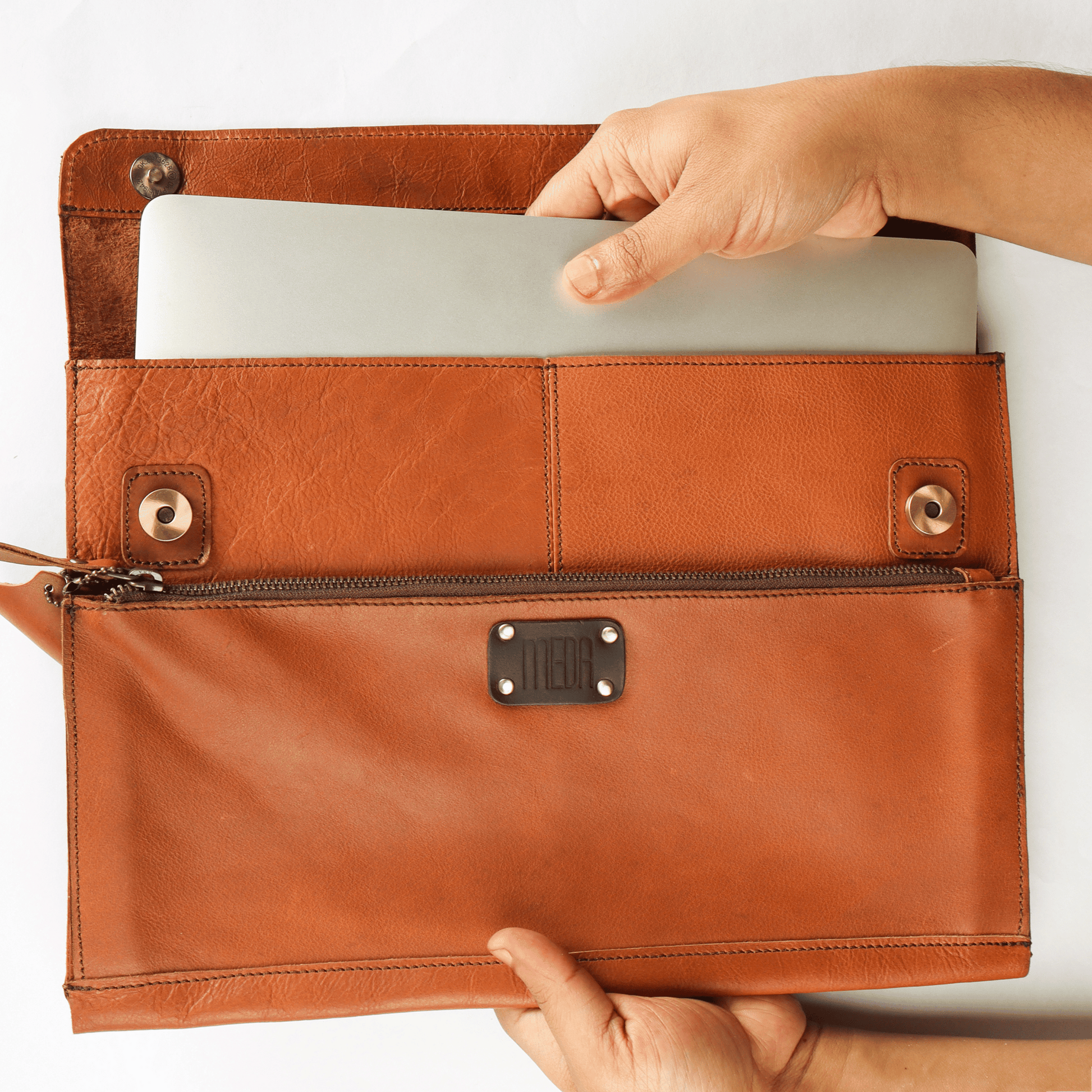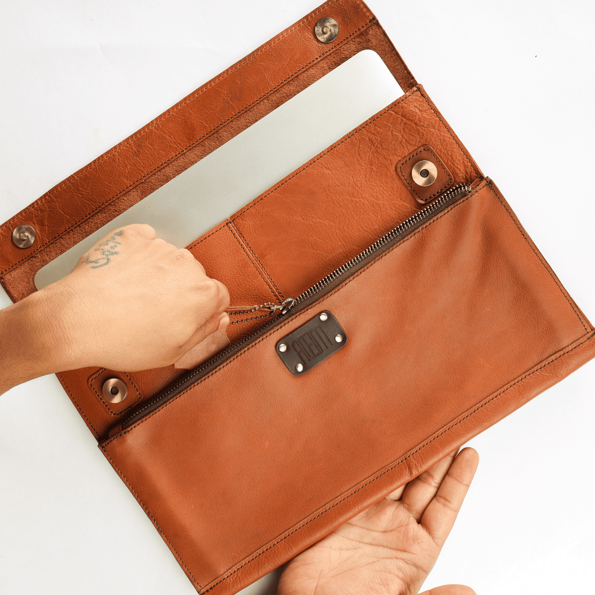 An easy all leather zipper compartment to keep your laptop and a compartment on the front to keep your diary and pen.