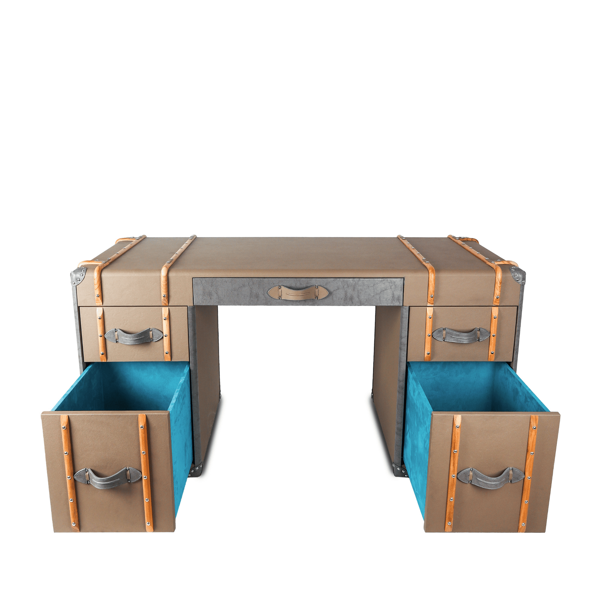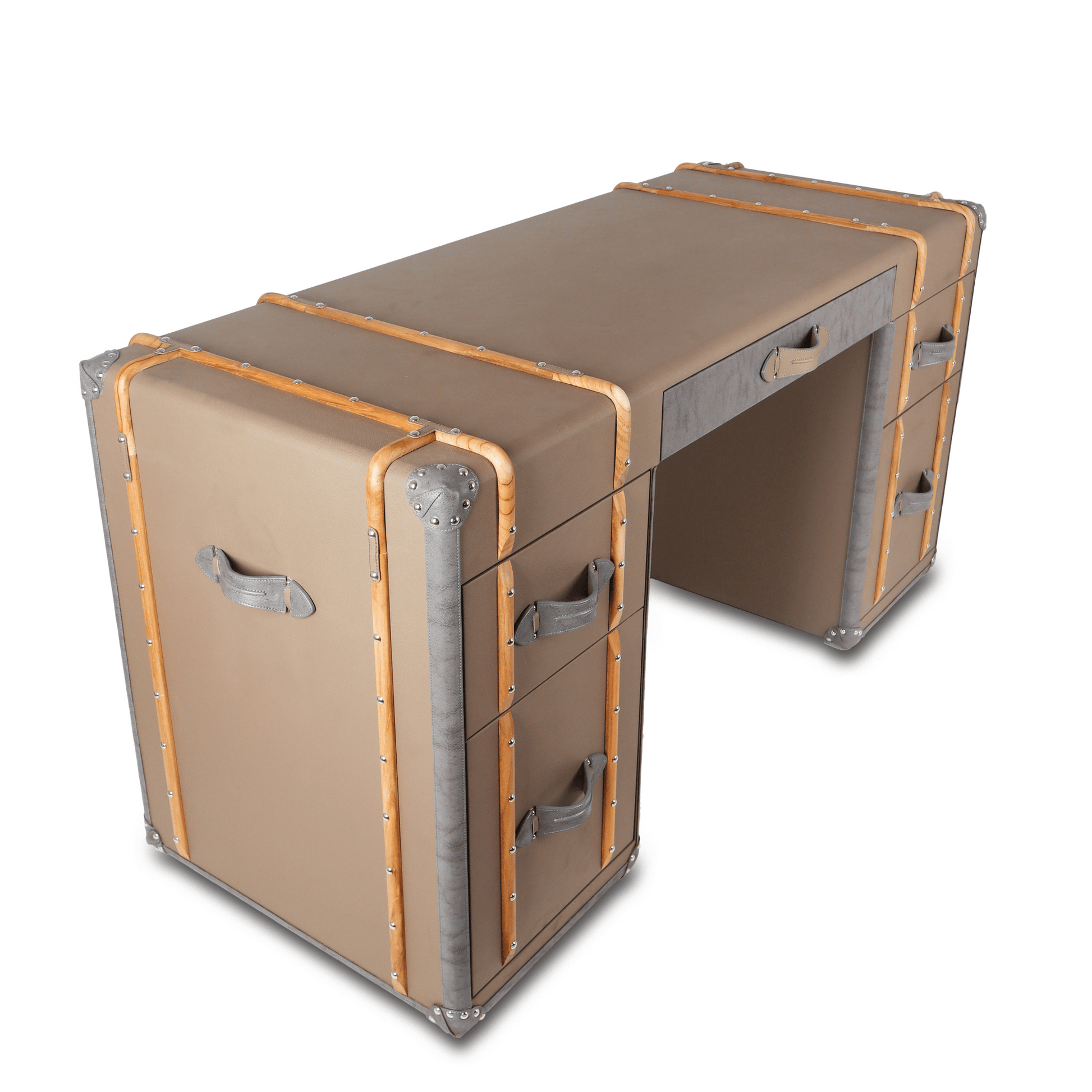 This eye-catching handcrafted cabinet will hold all that your bar needs and is ideal for entertaining at home. The beautiful leather exterior is accentuated with classic belt details and the doors open up to display a spacious suede-lined interior that is organized for easy access. The cabinet is mounted on reinforced sturdy wheels that allow easy movement. Enjoy the experience of entertaining at home, with this one-of-a-kind, statement-making piece of design and craftsmanship.