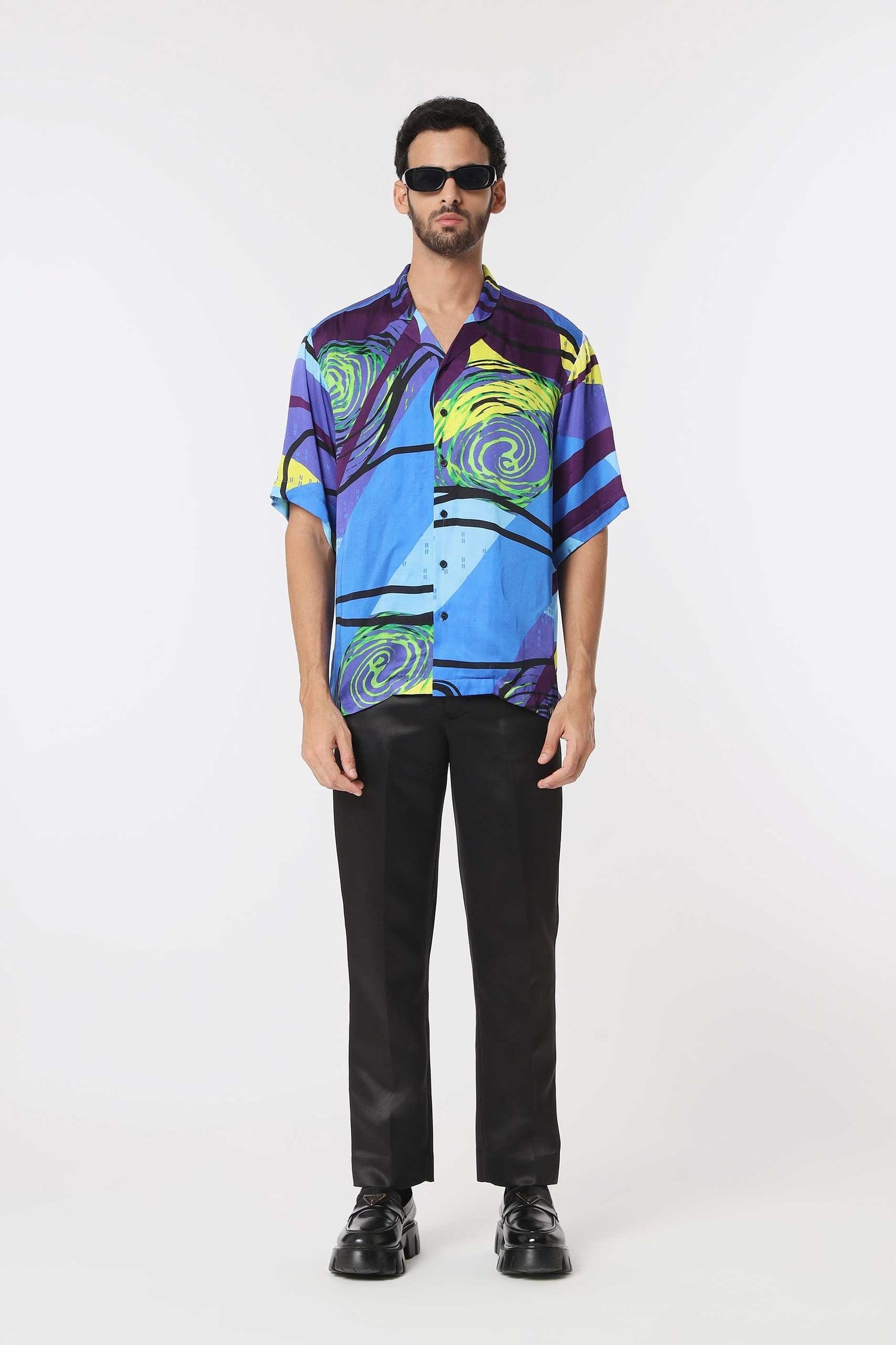 An abstract shirt digitally printed on modal satin fabric, featuring hues of blue and designed with a relaxed fit, offers a unique combination of artistic expression and comfort.