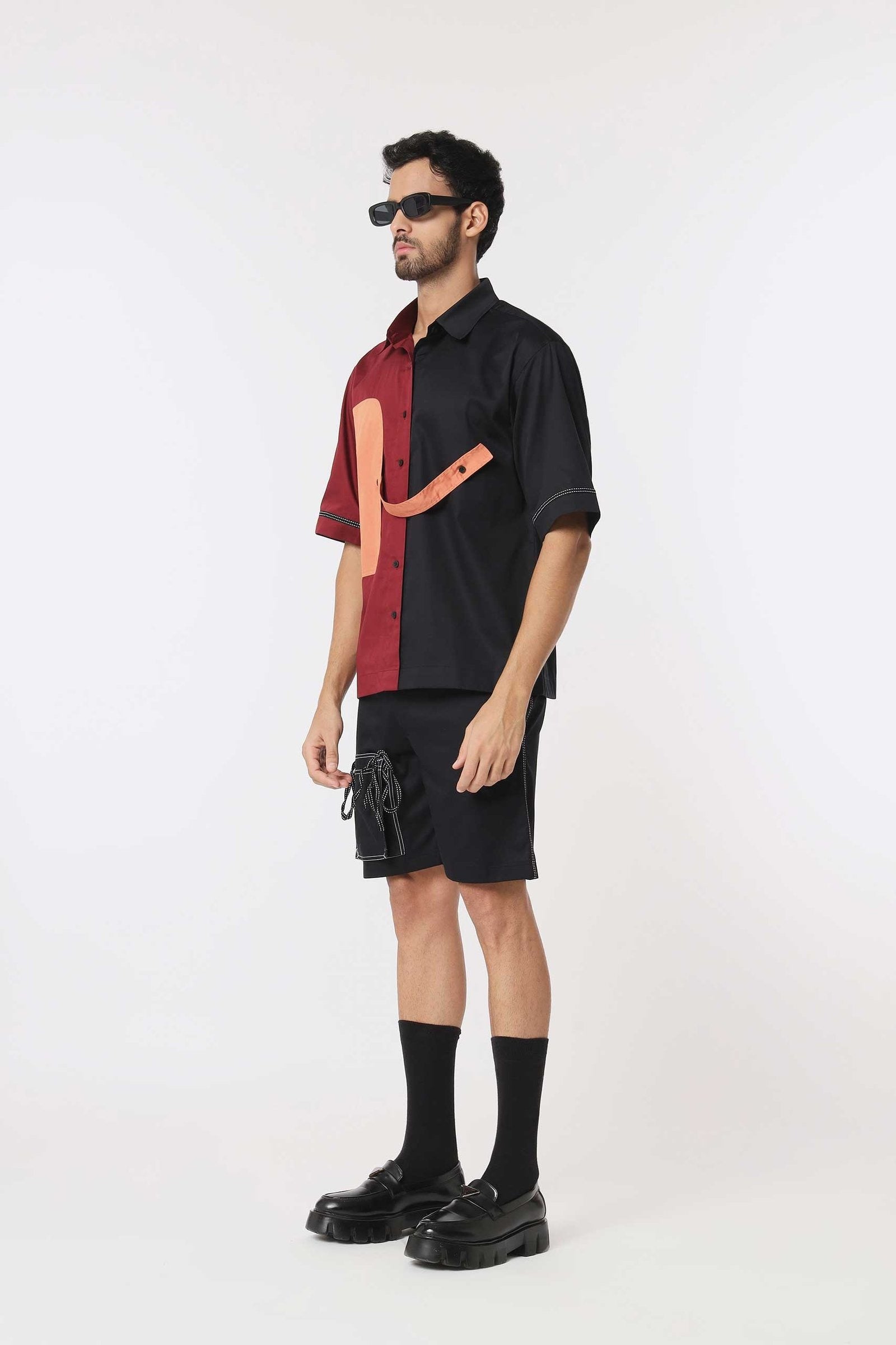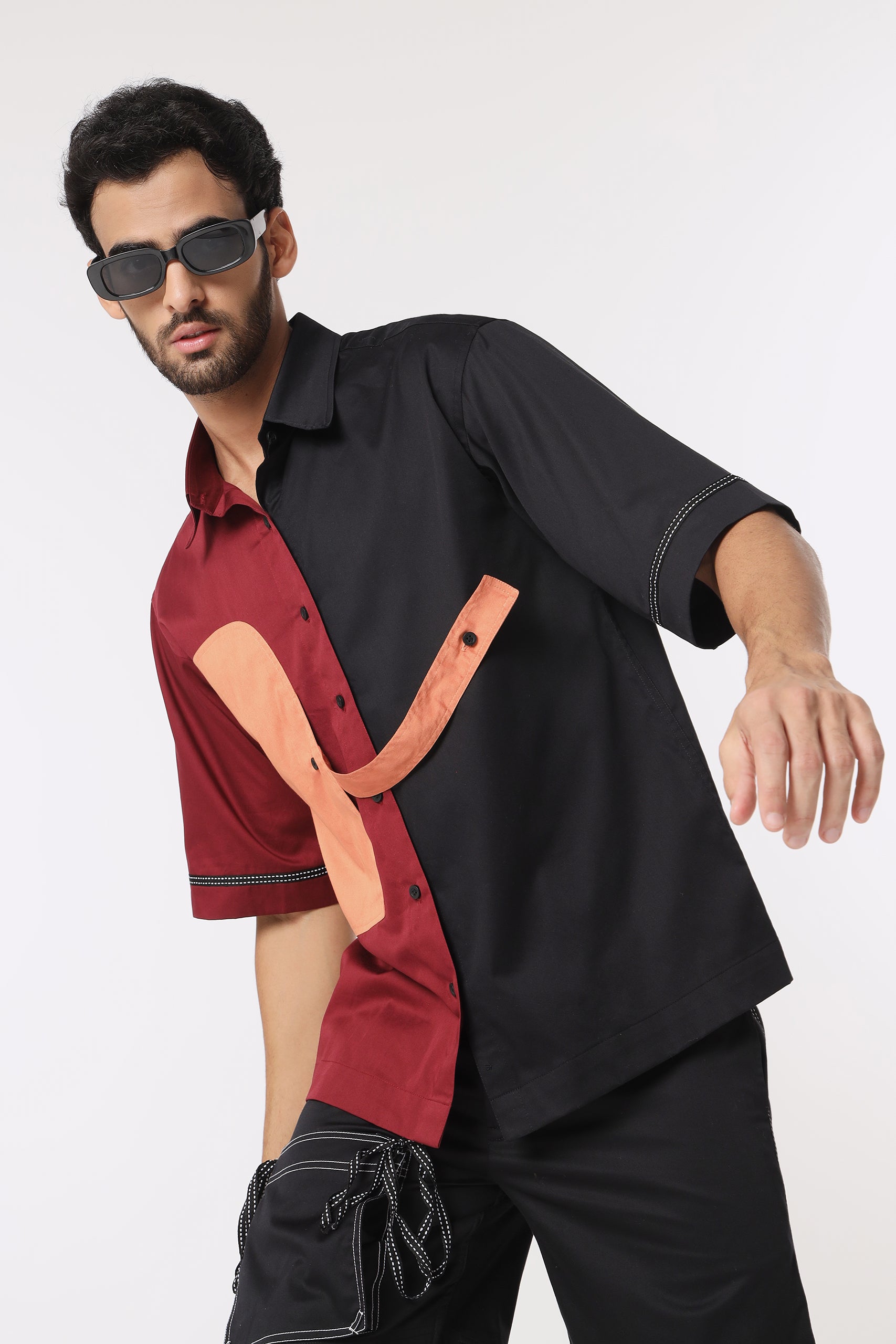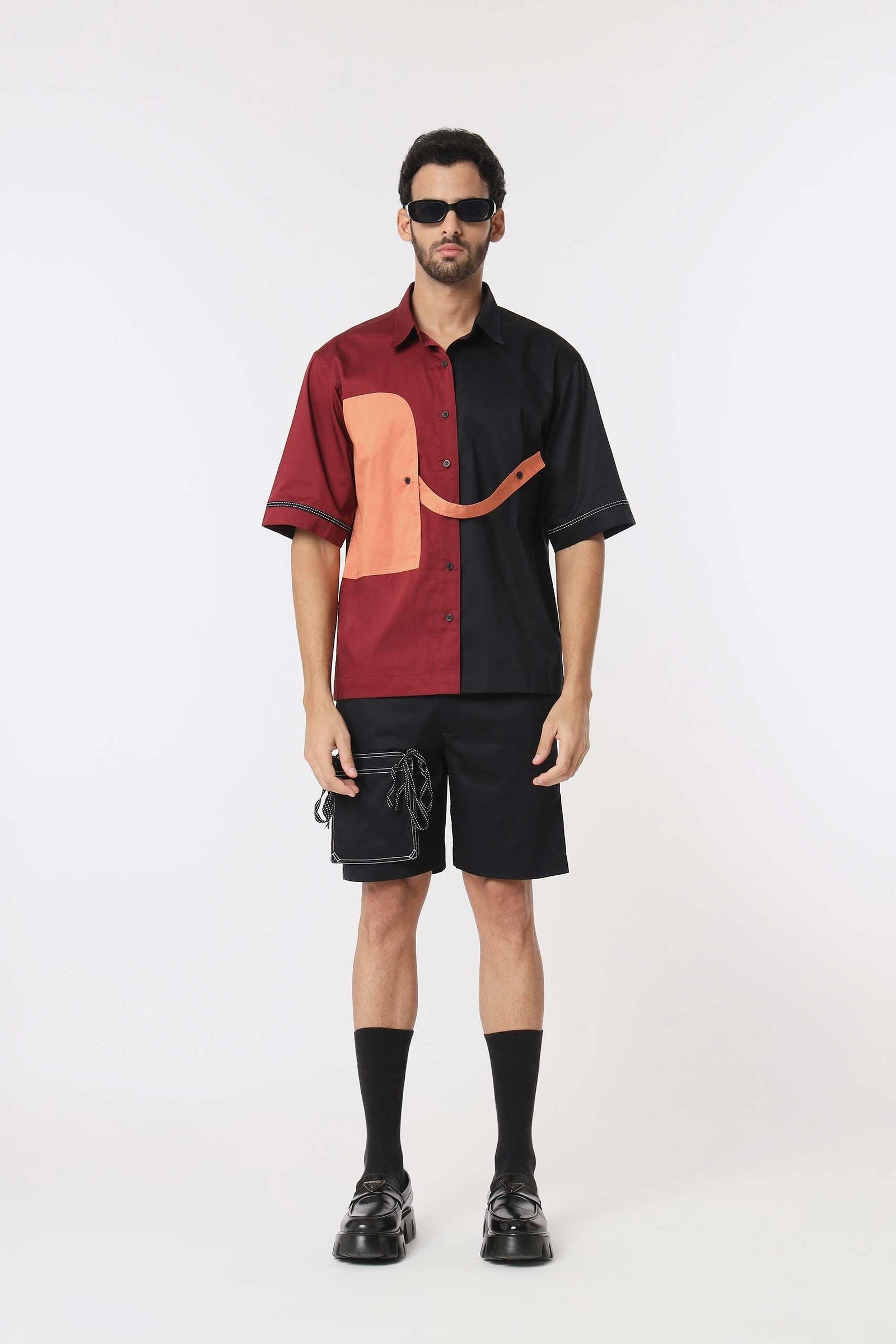 A color block shirt with a stylized pocket and minimal cotton tape details on the sleeves offers a contemporary and sleek aesthetic. The combination of bold color blocks and subtle embellishments creates a modern yet understated look, perfect for adding a touch of sophistication to any outfit.