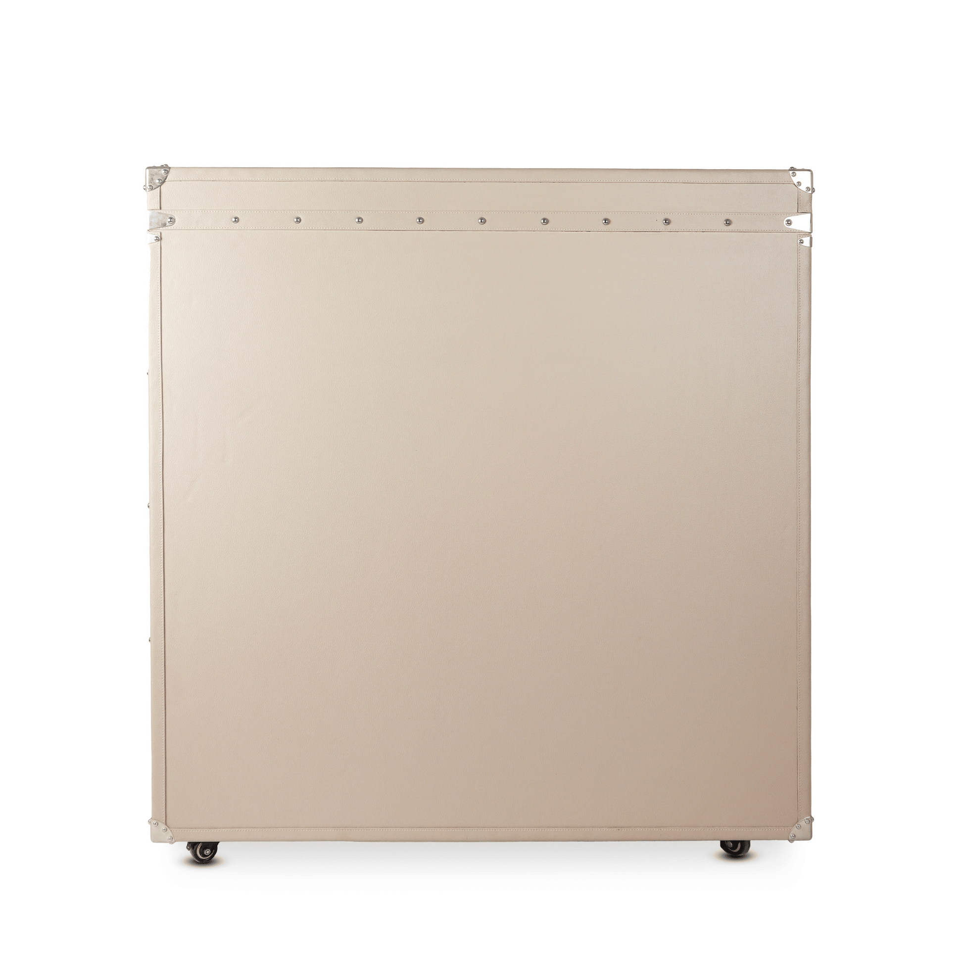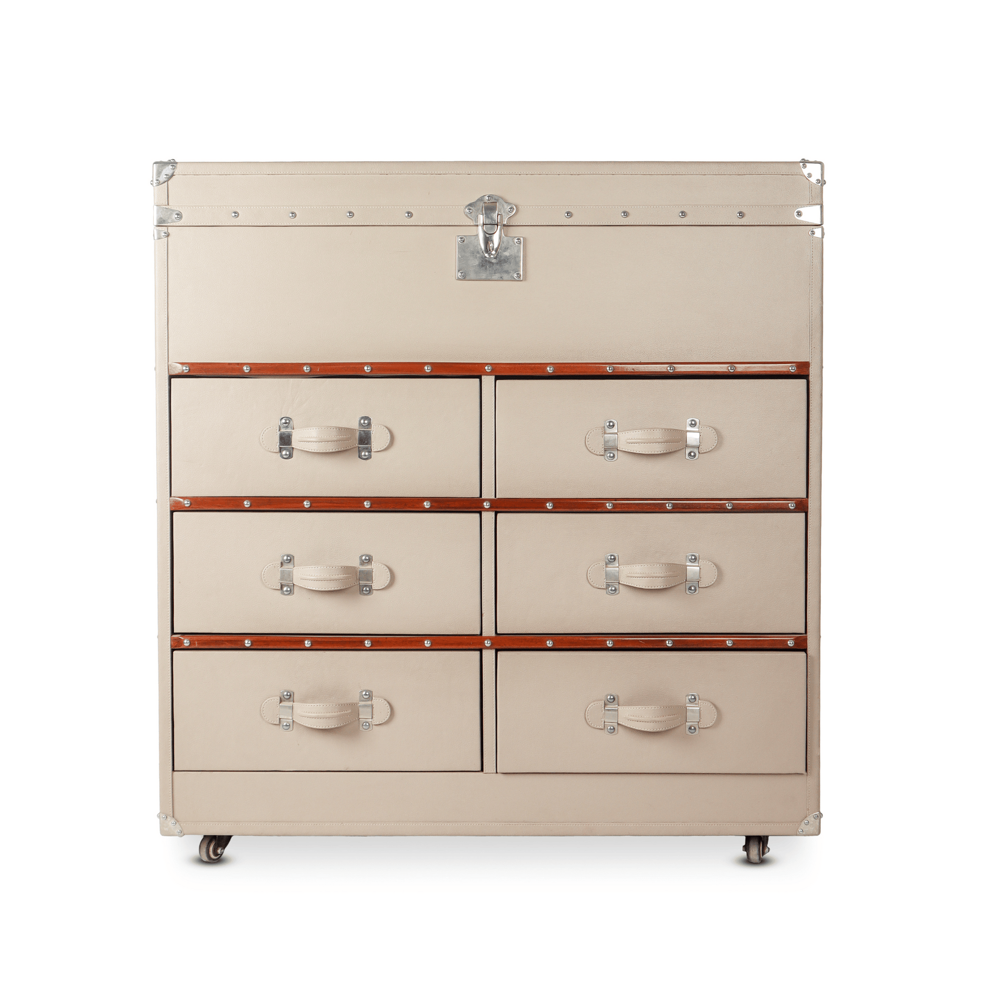 The brass metal handles adorning each drawer add a touch of sophistication, perfectly complementing the textured taupe leather exterior. Step inside the drawers to discover a luxurious suede lining, ensuring your belongings are protected and pampered. This utility pieces stands on MS less brushed in gold finish.