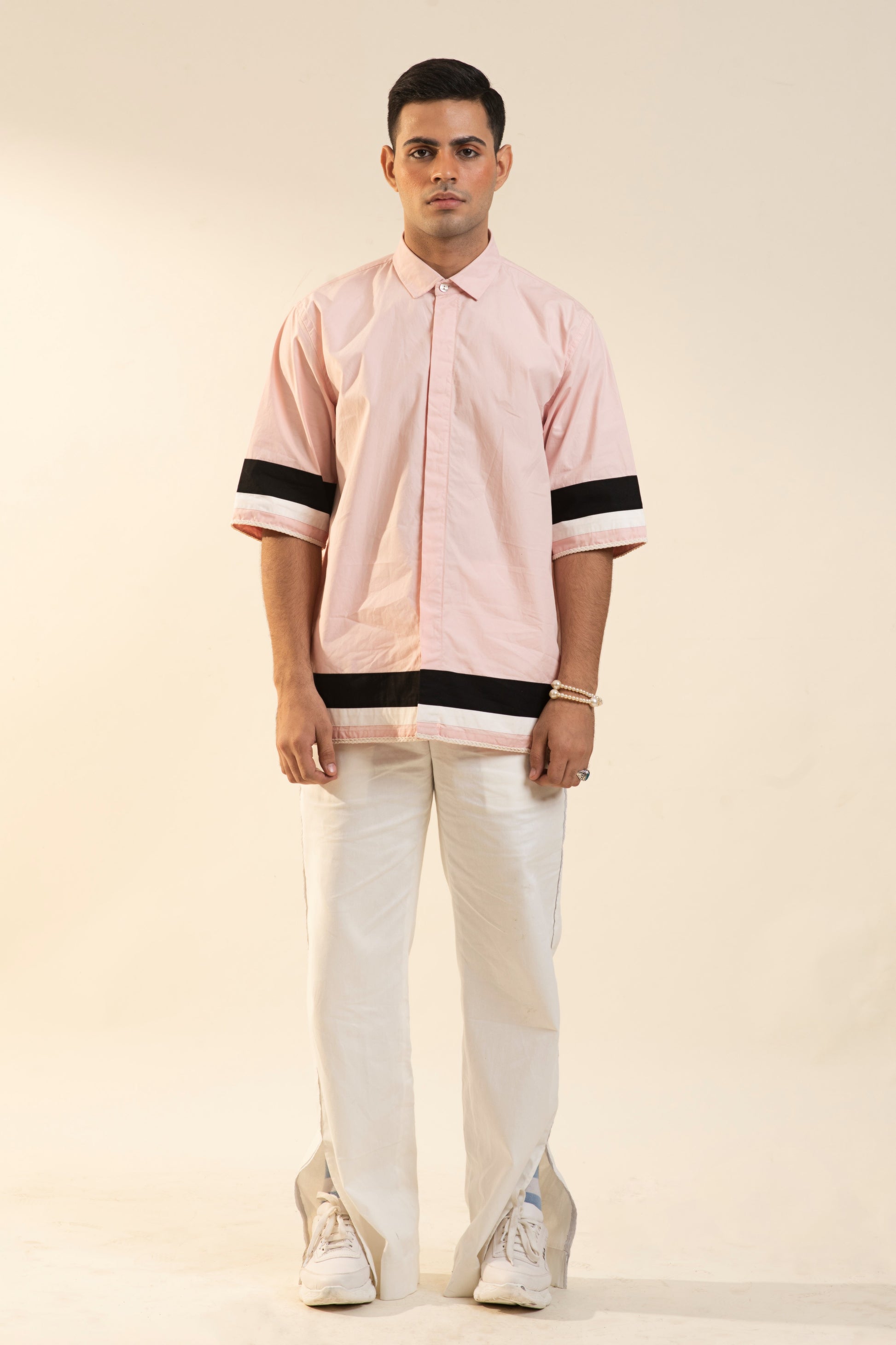 Vanilla Ice Pink Cotton Shirt with color blocked black and ivory strips finished with braided silk lace on sleeves and hem with relaxed fit, conceal placket, half sleeves and shell buttons.
