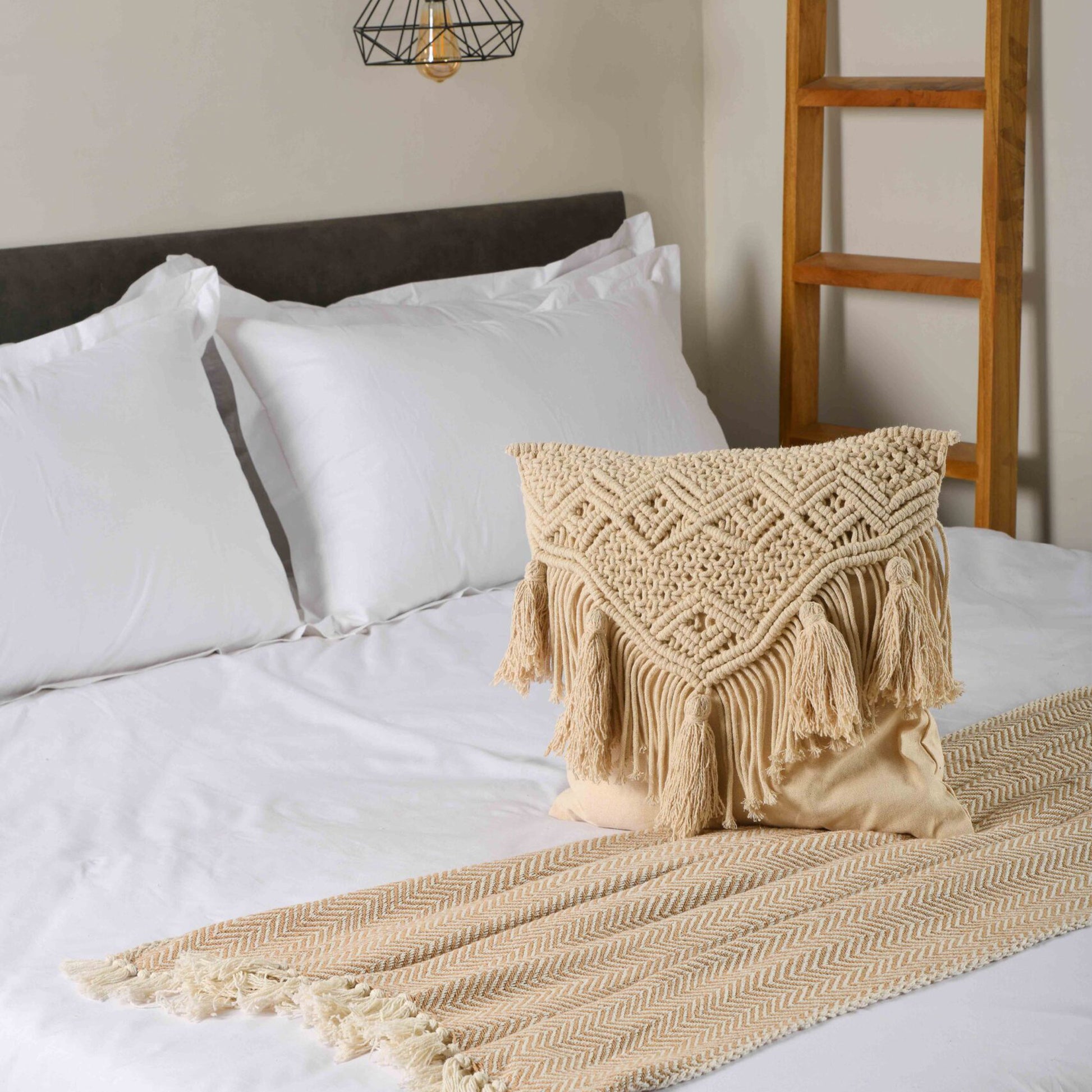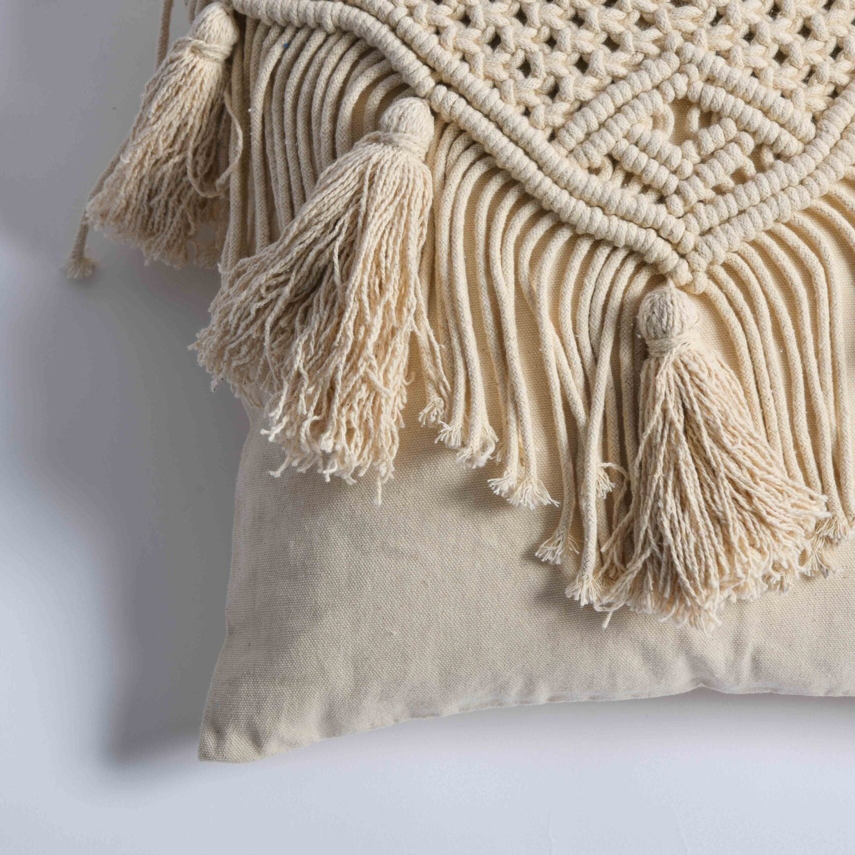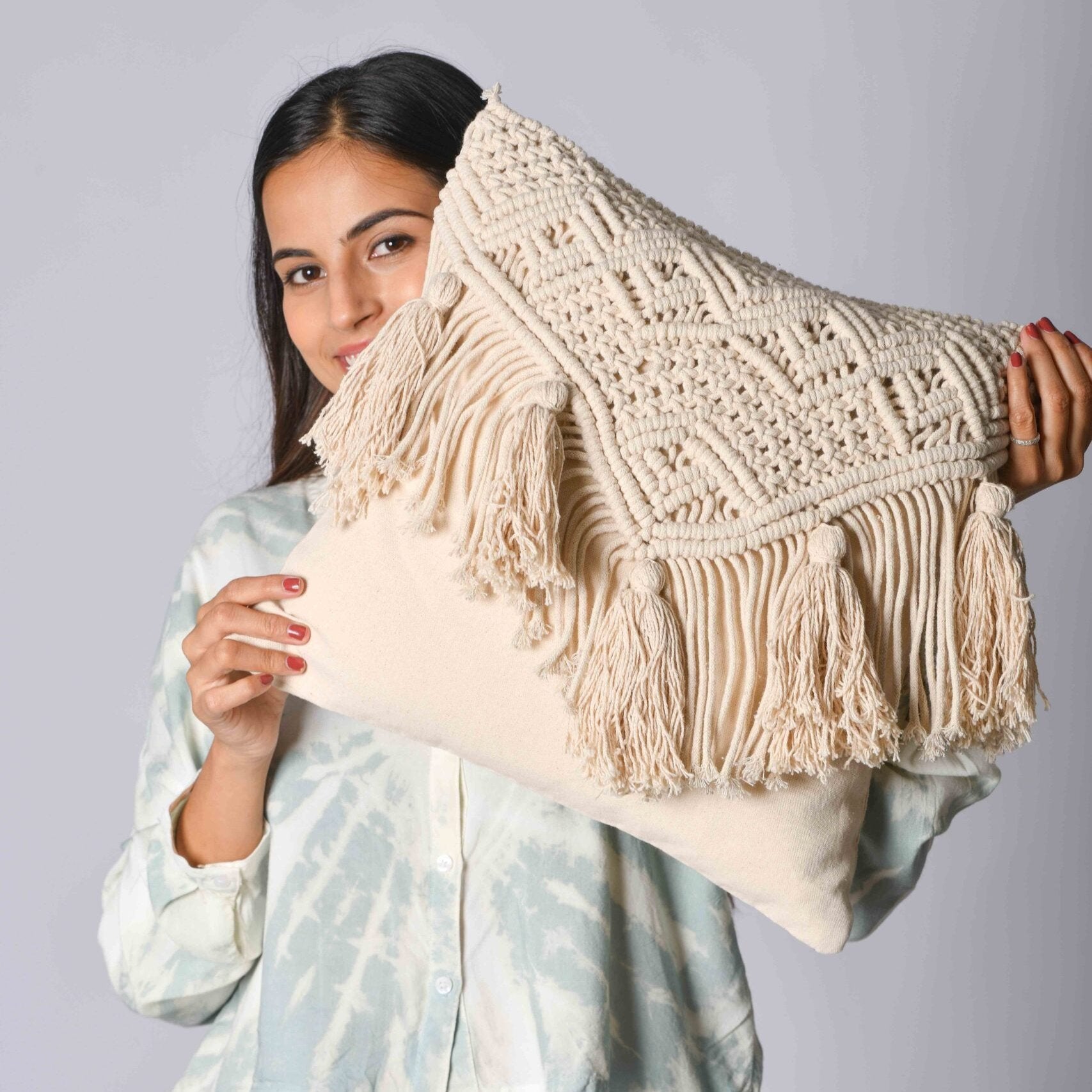 Bring home this free spirited Bohemian style Macrame art piece to adorn your home décor. Macrame textiles are created using knotting techniques as against weaving or knitting. This elegant and unique textile cushion cover is a definite buy for your home. It’s calm and relaxing nude color manifests peace and serenity. Made out of pure cotton yarn, these minimalistic cushions blend well with beds and sofas of all color tones.
