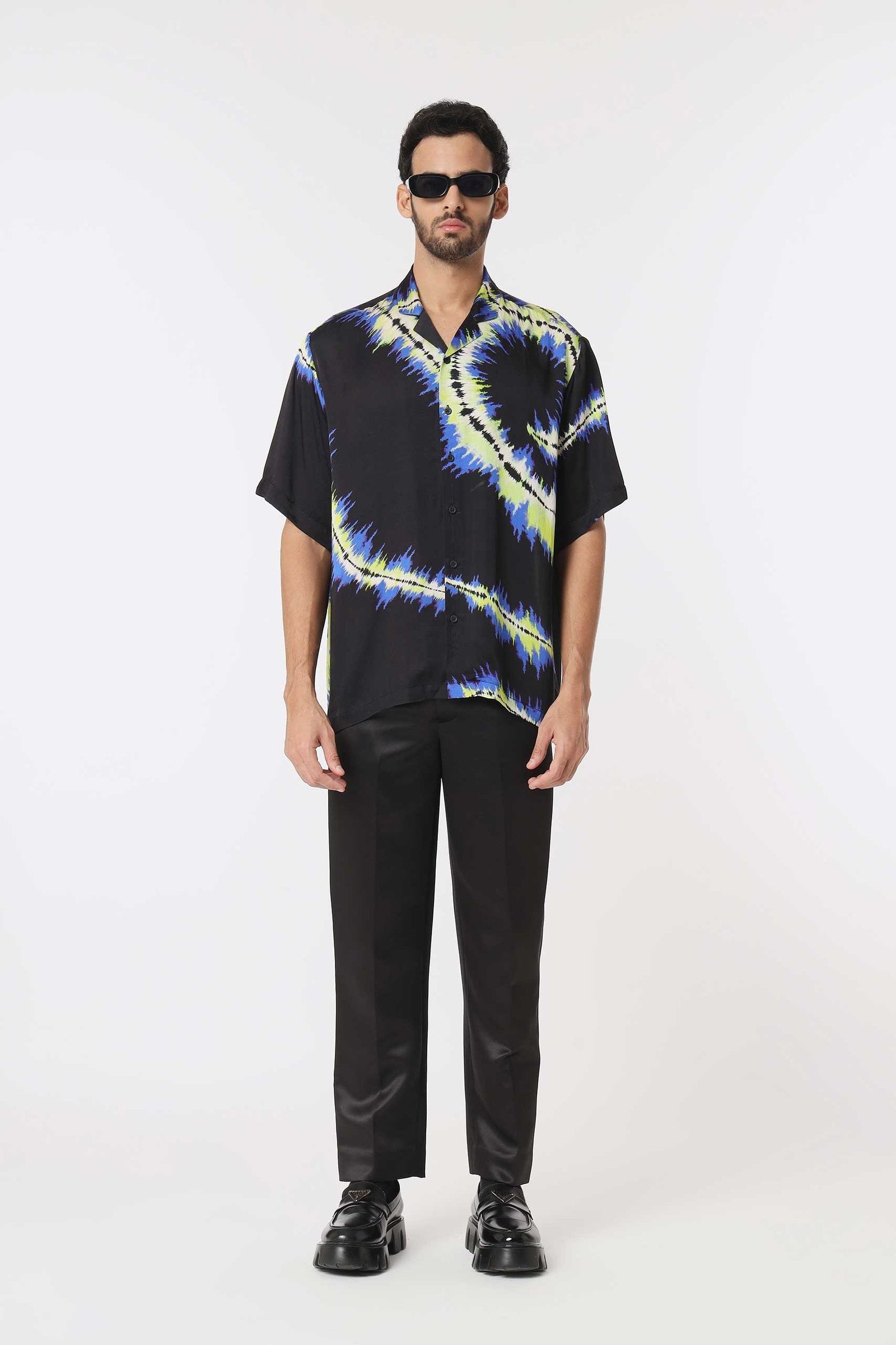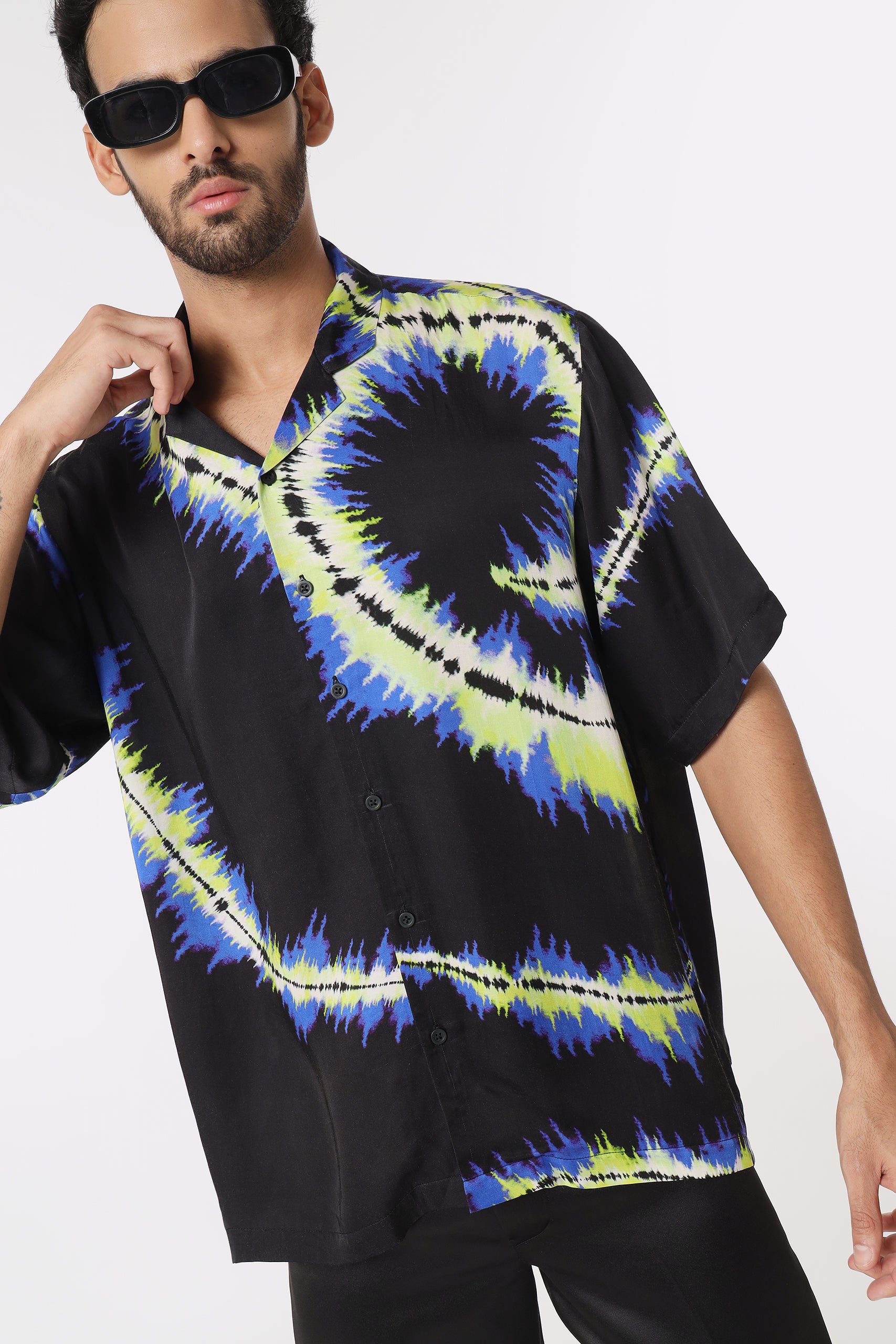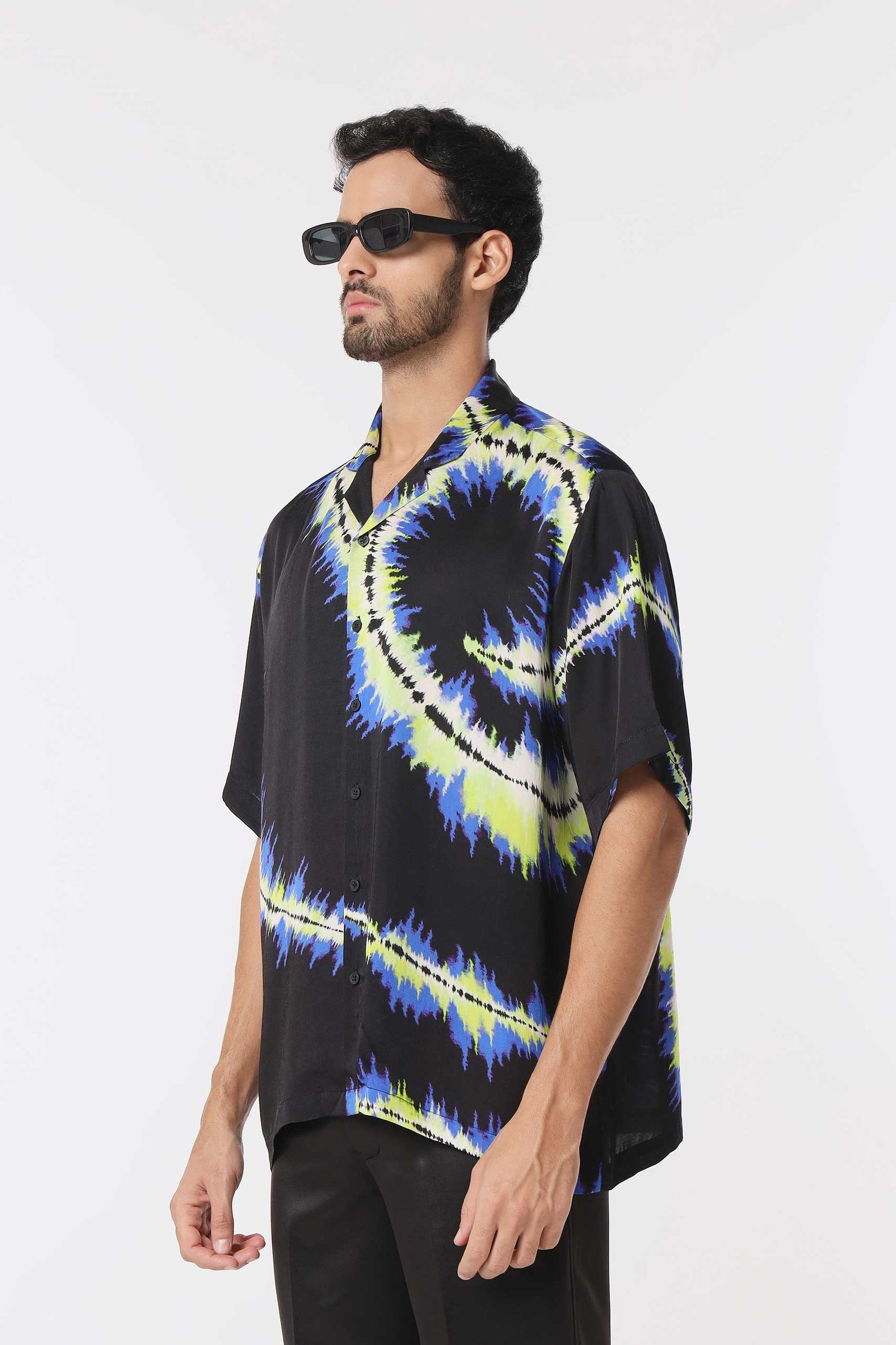 A tie-dye inspired graphical printed shirt digitally printed on Modal satin fabric comes with a modern twist on a classic technique. The Modal satin fabric enhance the vibrancy of the colors, and the relaxed fit provides both style and comfort.