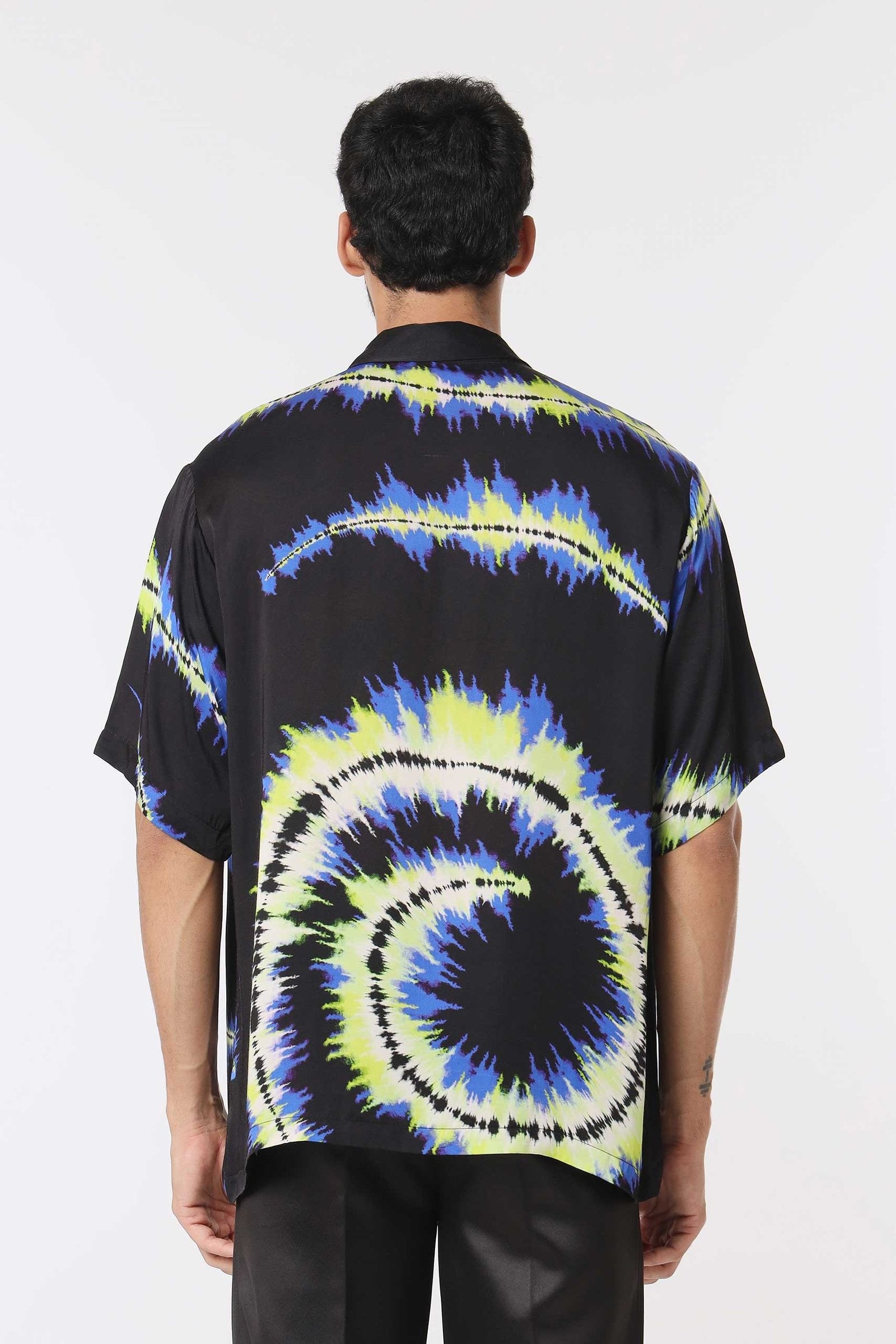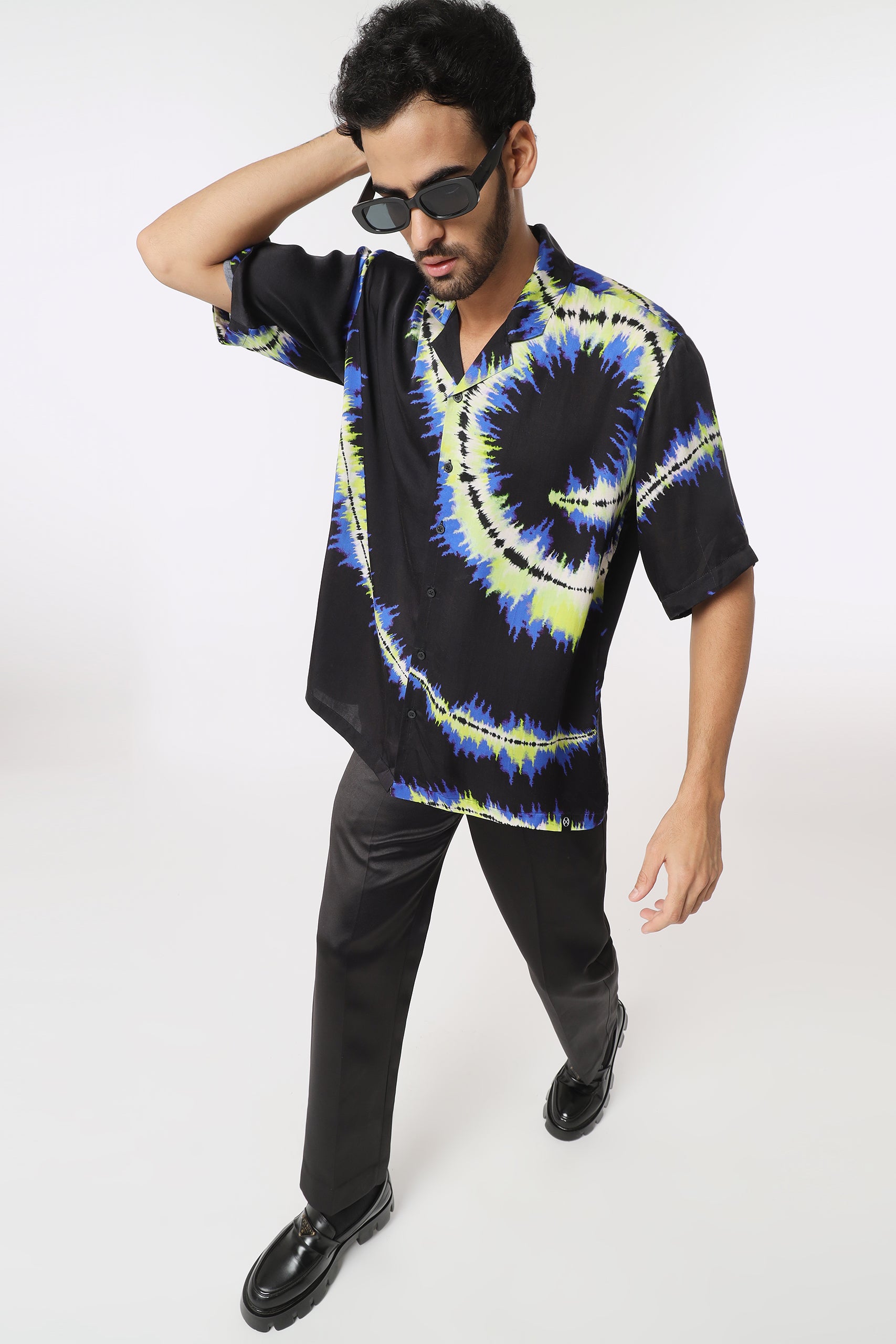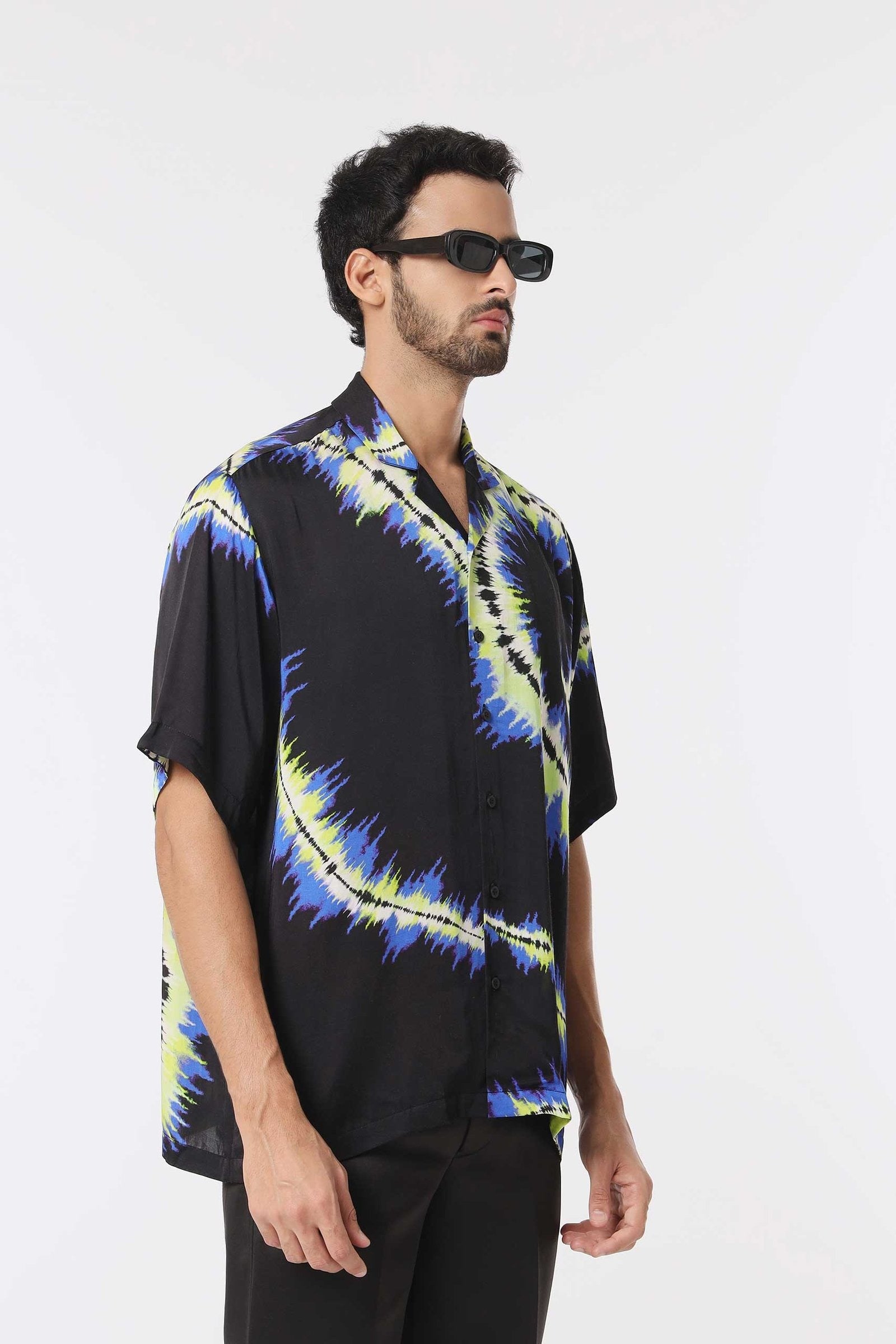 A tie-dye inspired graphical printed shirt digitally printed on Modal satin fabric comes with a modern twist on a classic technique. The Modal satin fabric enhance the vibrancy of the colors, and the relaxed fit provides both style and comfort.