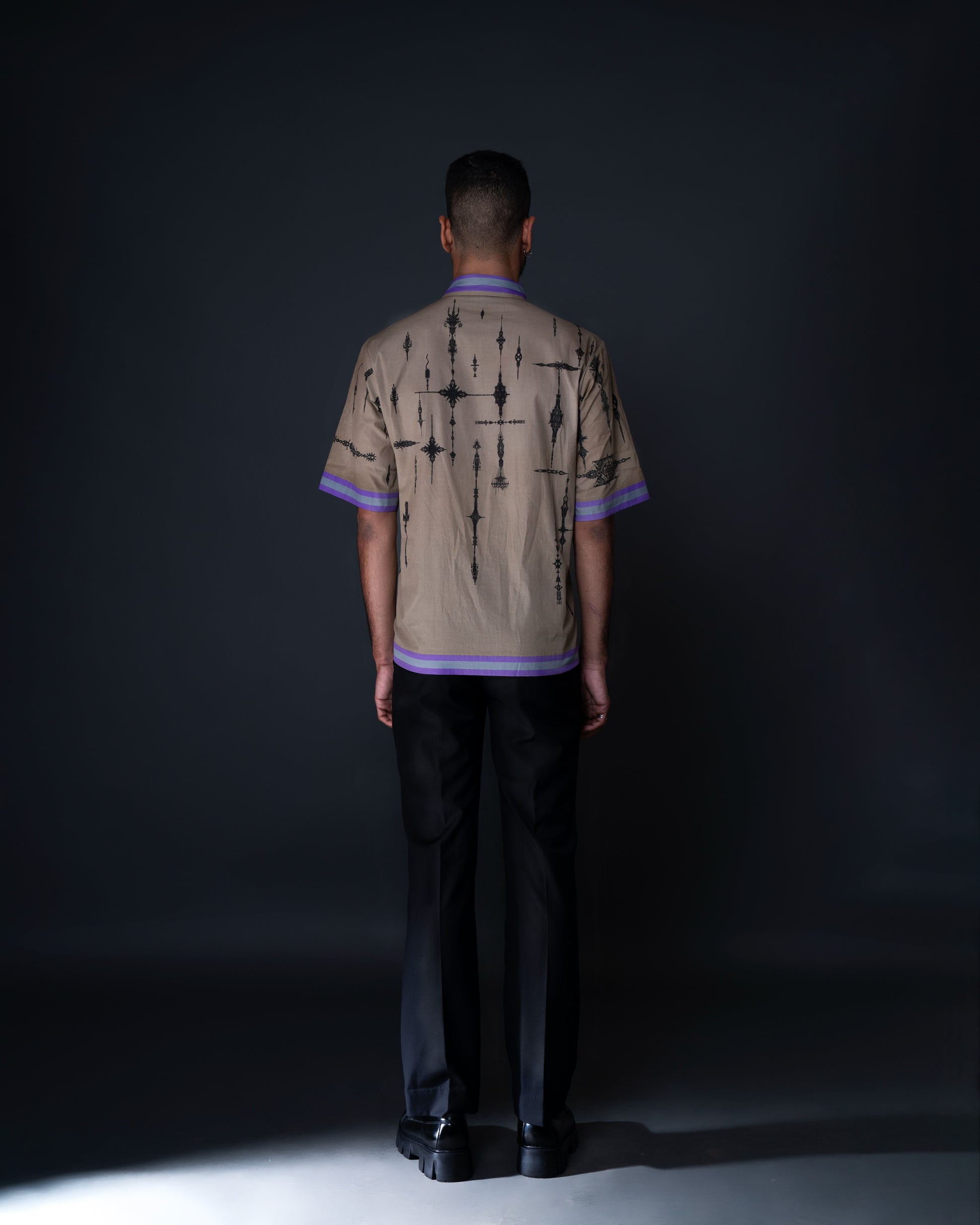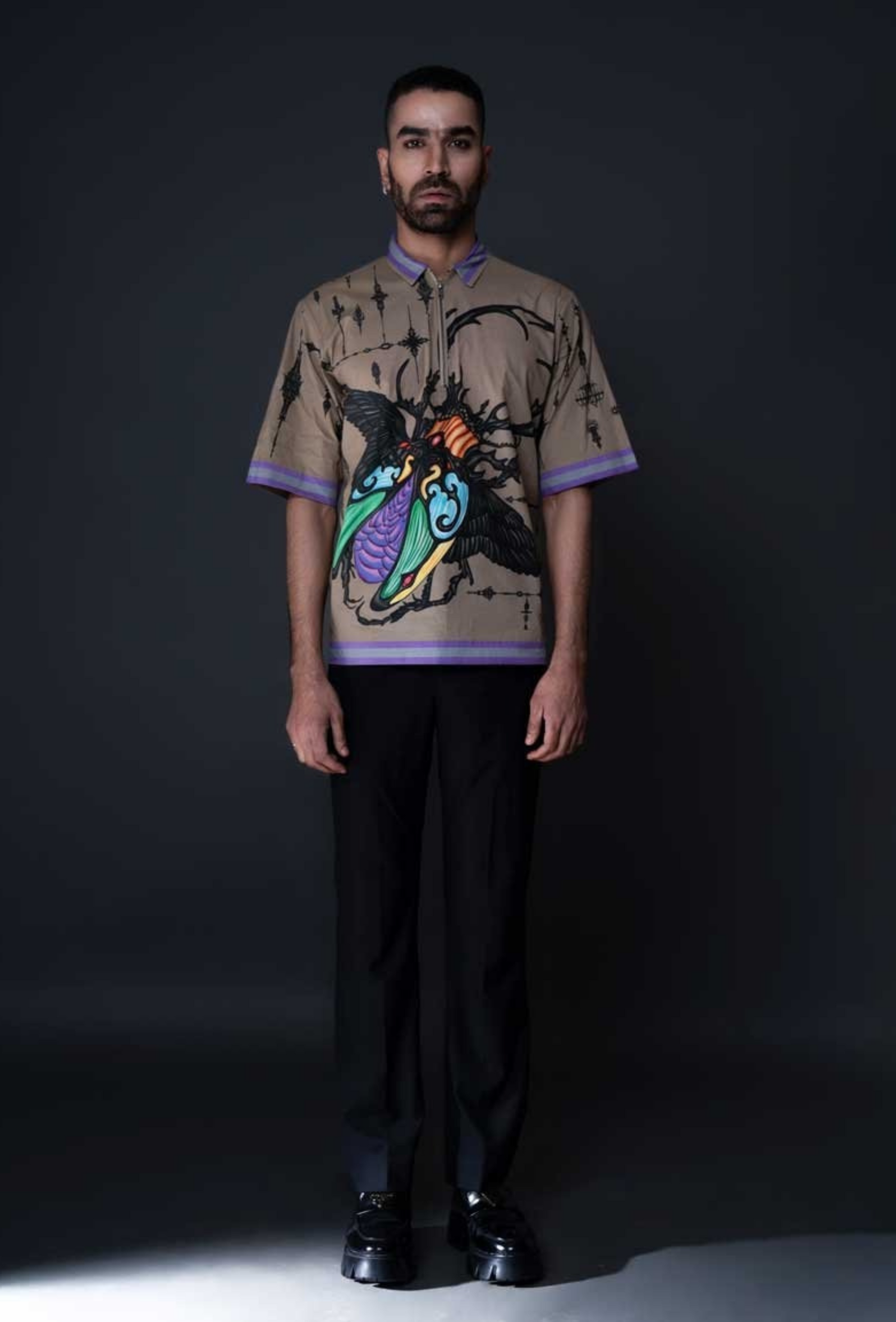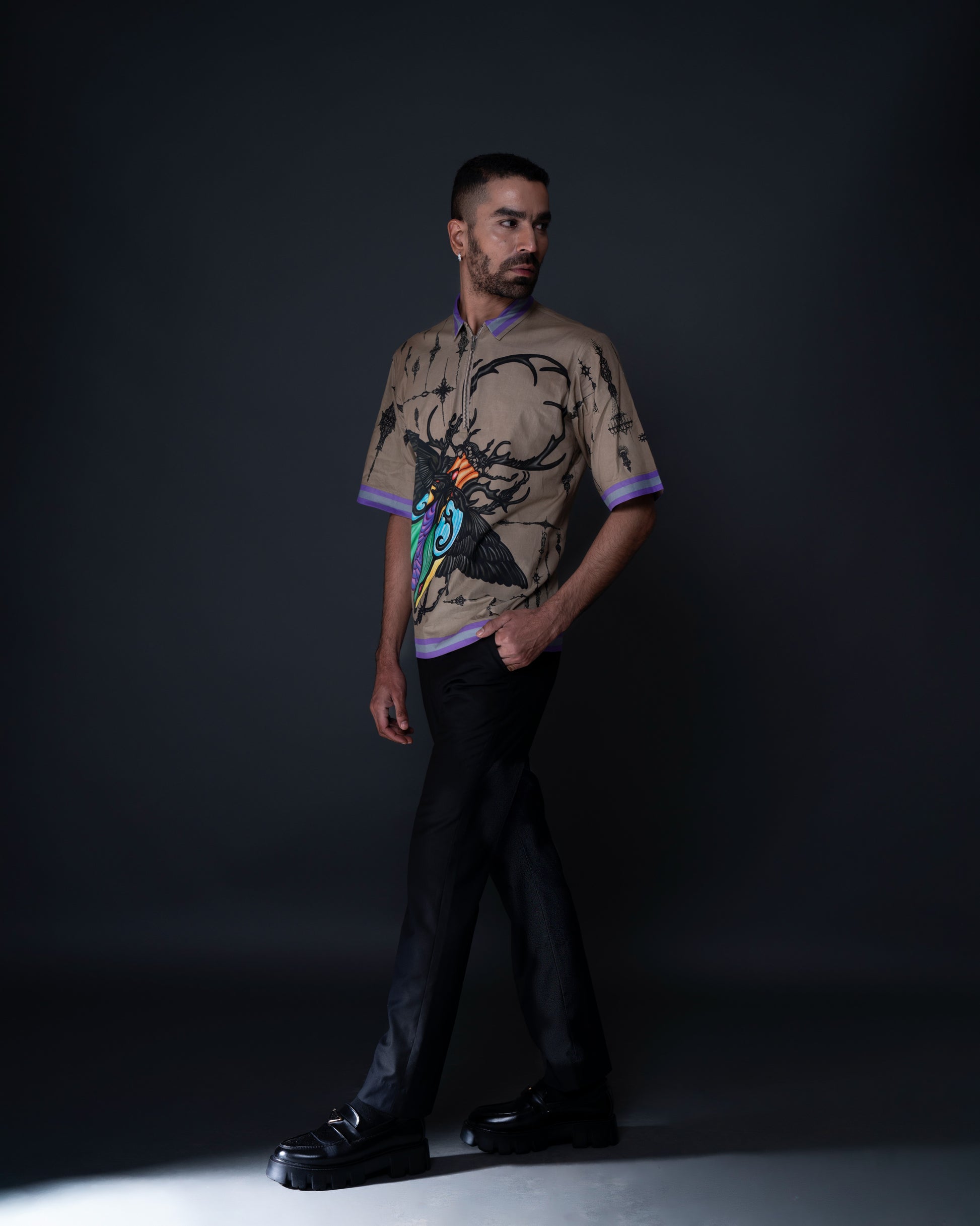A beige color shirt featuring a giant moth artwork digitally printed on fine quality cotton satin fabric exudes sophistication and style. The relaxed fit ensures comfort, while the zipper opening adds a contemporary touch. It’s definitely a statement piece that combines artistry with modern design elements.
