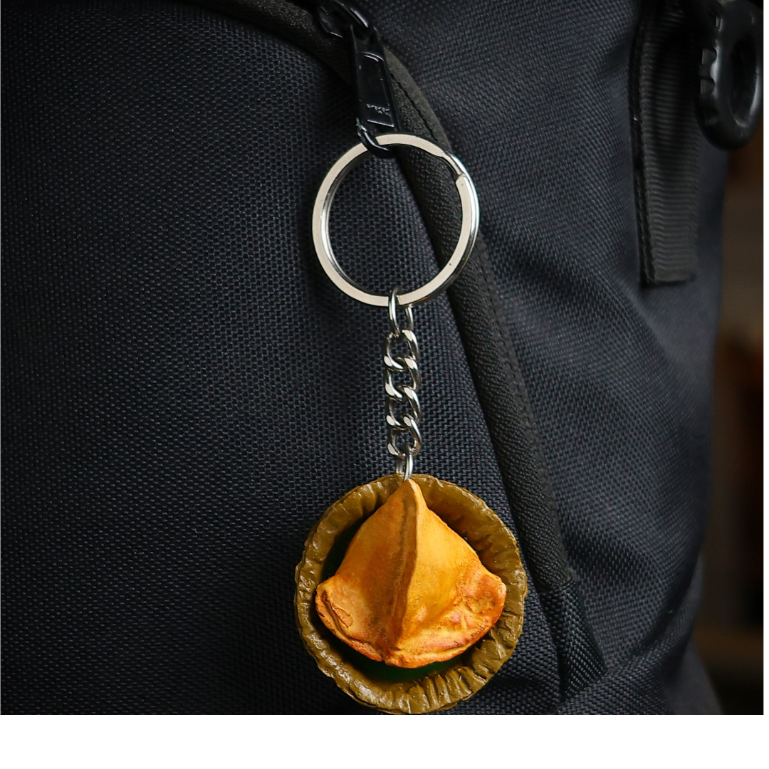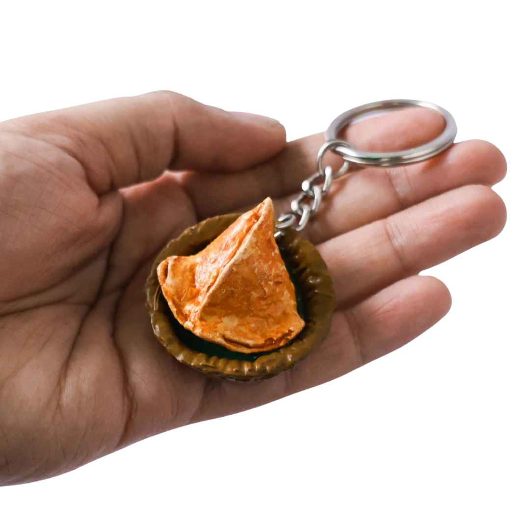 Samosa, Indian snack that needs no introduction! A snack that has been a part of every household discussion over Chai. Crispy on the outside, flavourful and spicy on the inside, these triangular delights are loved by people of all ages. Introducing our charming Clay Samosa Miniature Keychain, a delightful representation of India’s favourite savoury snack. Crafted with attention to detail, each miniature captures the essence of the crispy pastry and the savoury filling of traditional samosas. Perfect for adding a touch of Indian culinary tradition or gifting to friends and family who savour spicy delights. Experience the joy of India’s beloved snack with our intricately handcrafted Samosa Miniature.