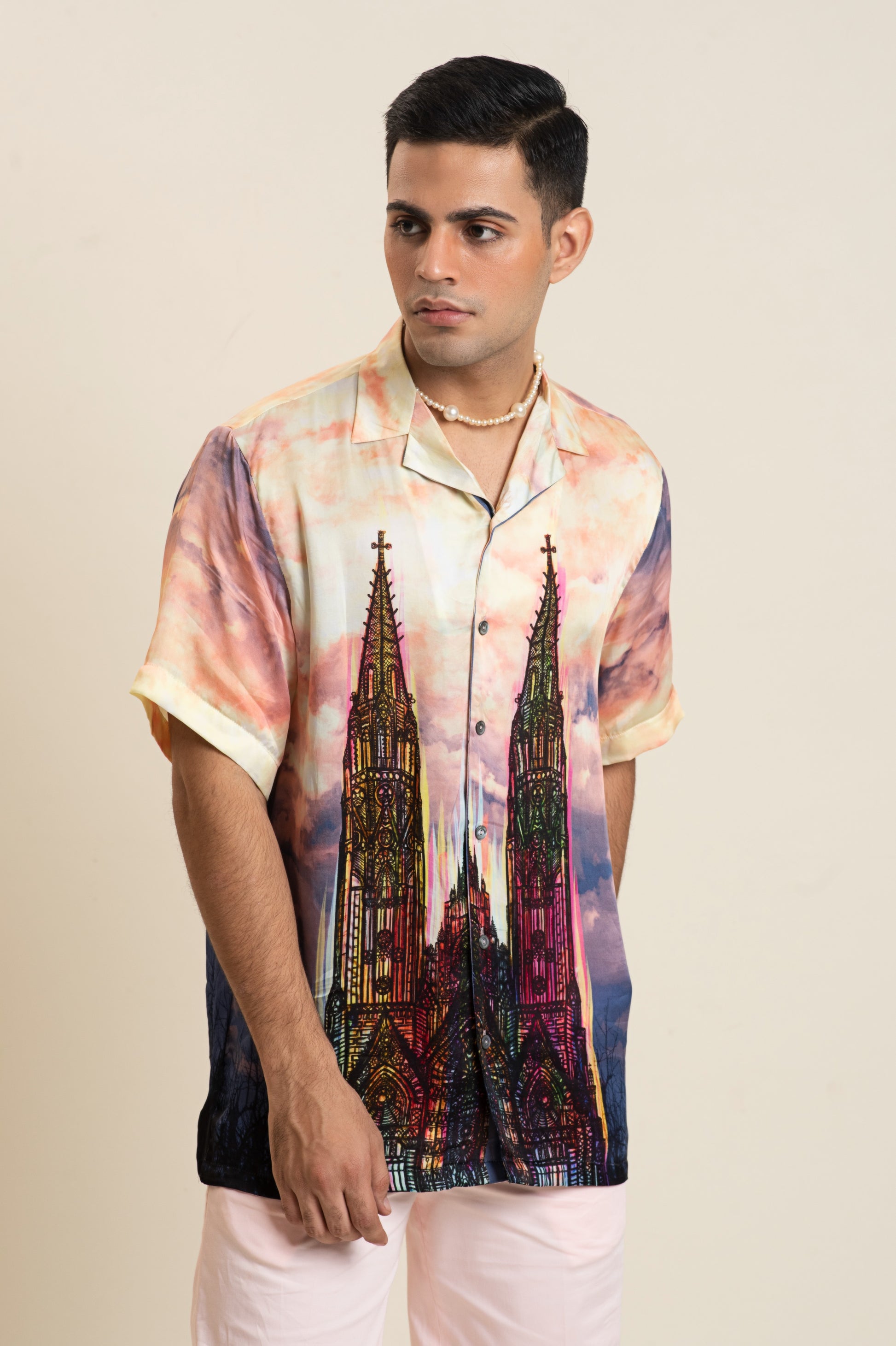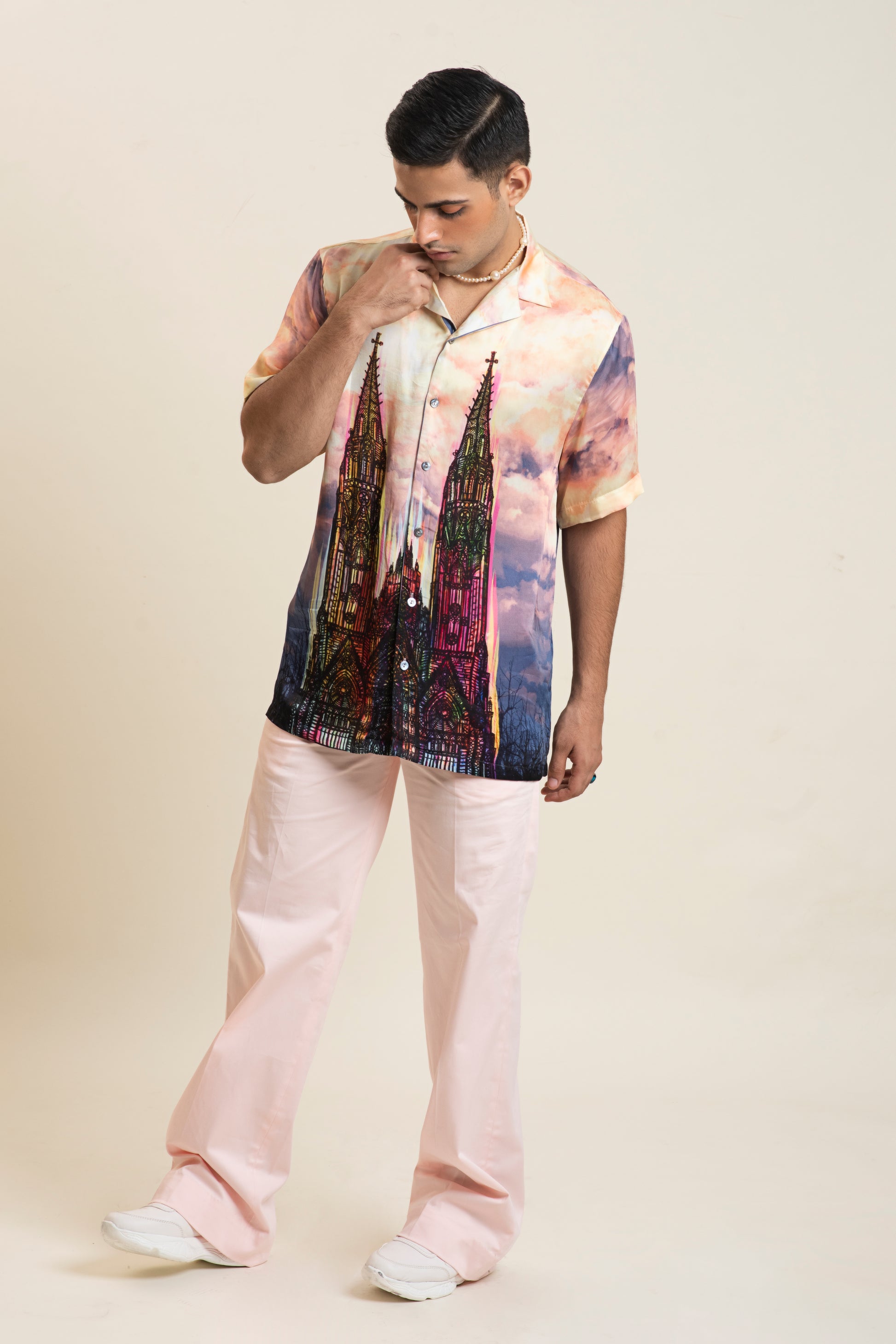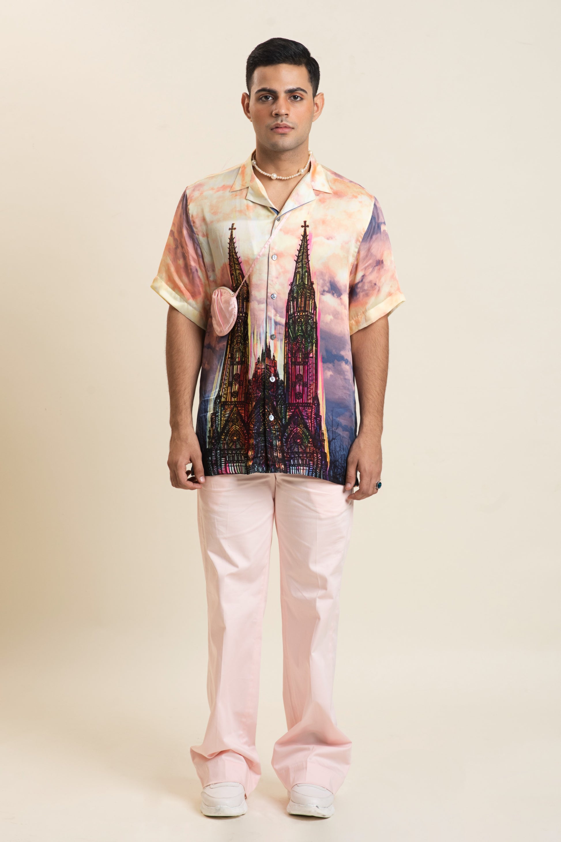 Digitally printed Pink Sunset shirt on Bemberg Satin with relaxed fit, camp collar, half sleeves and shell buttons inspired from St. Nicholas Cathedral, Kiev, Ukraine with Dark Hour logo on back.