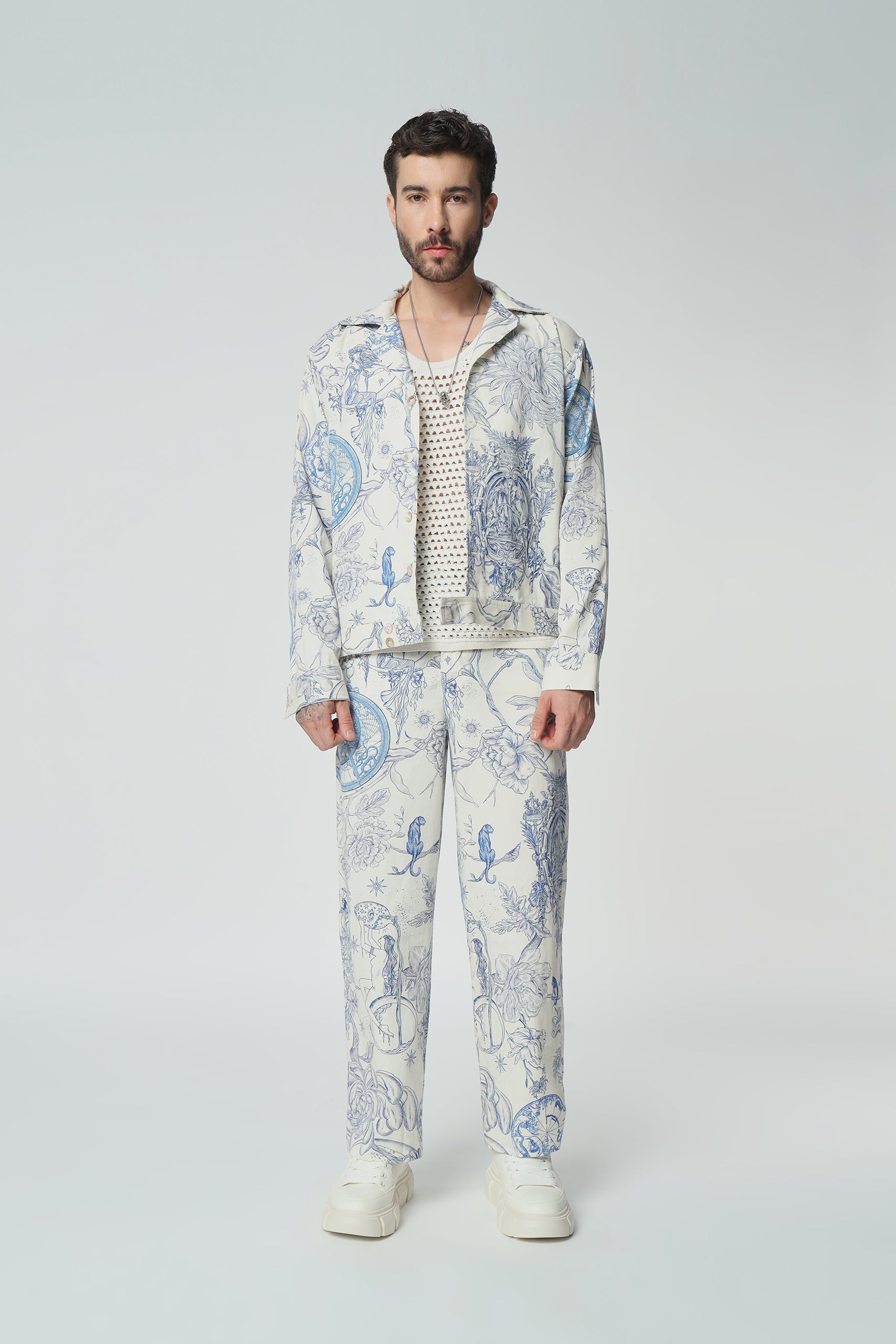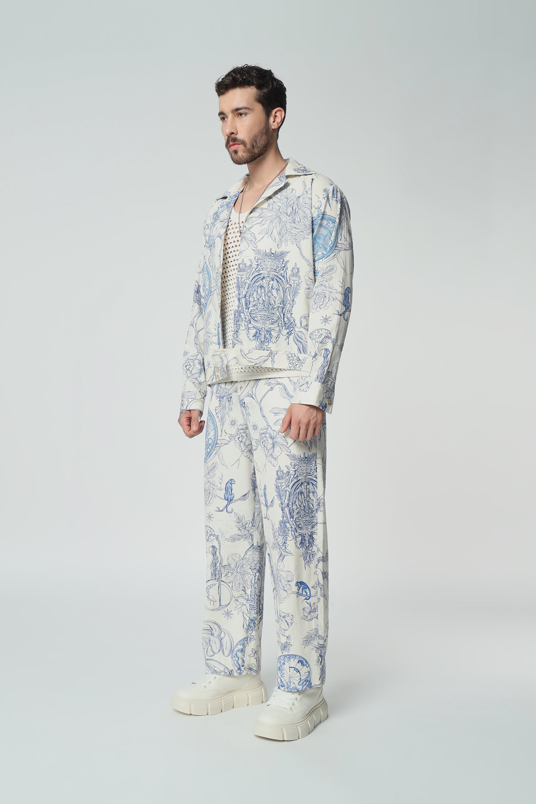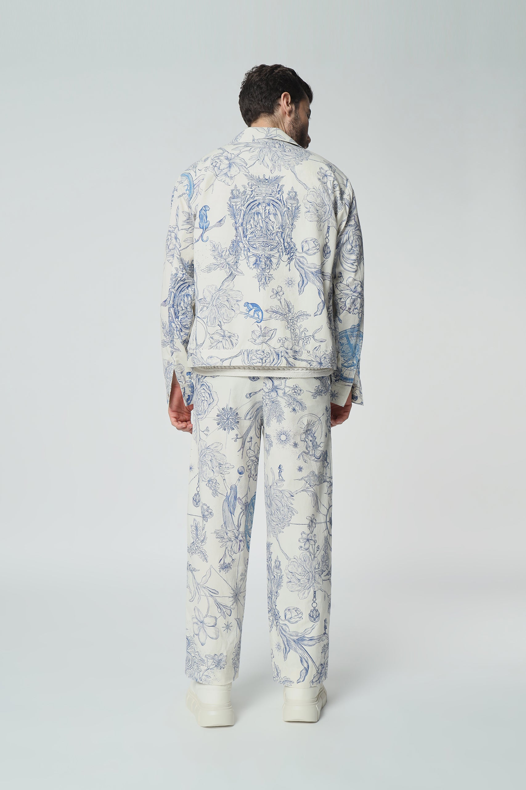 “Complete the ensemble with our matching toile de Jouy pants. Embrace coordinated elegance with this stylish pairing, perfect for making a statement with timeless flair.”