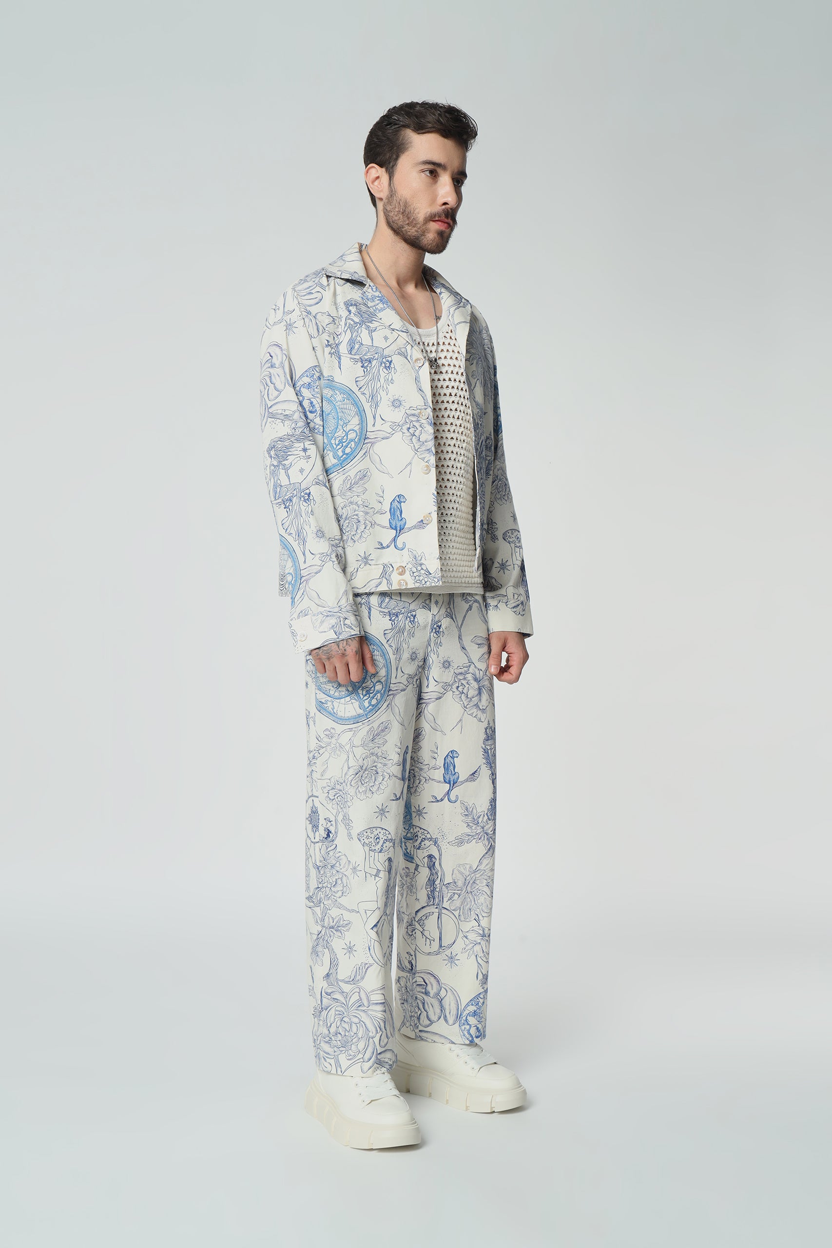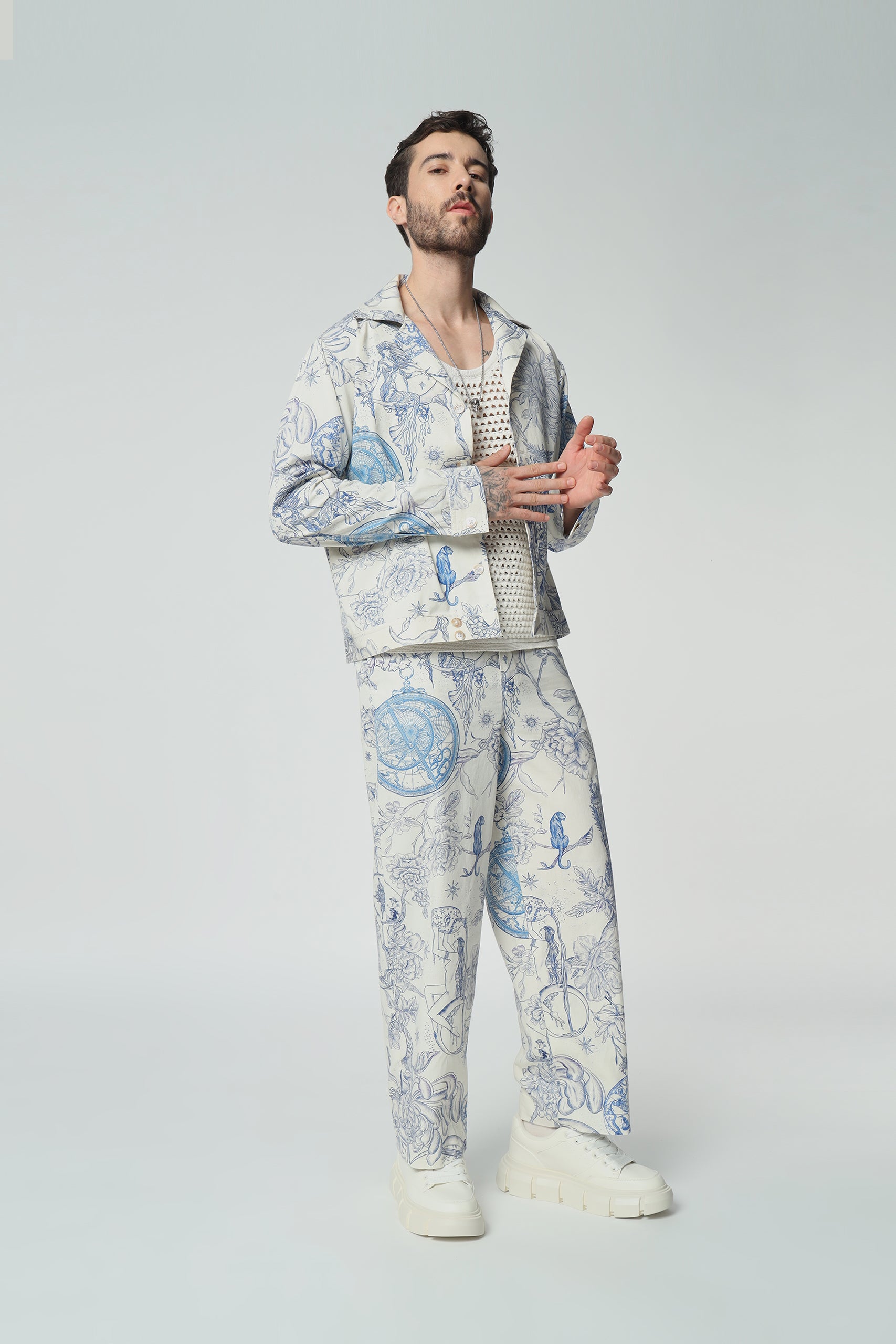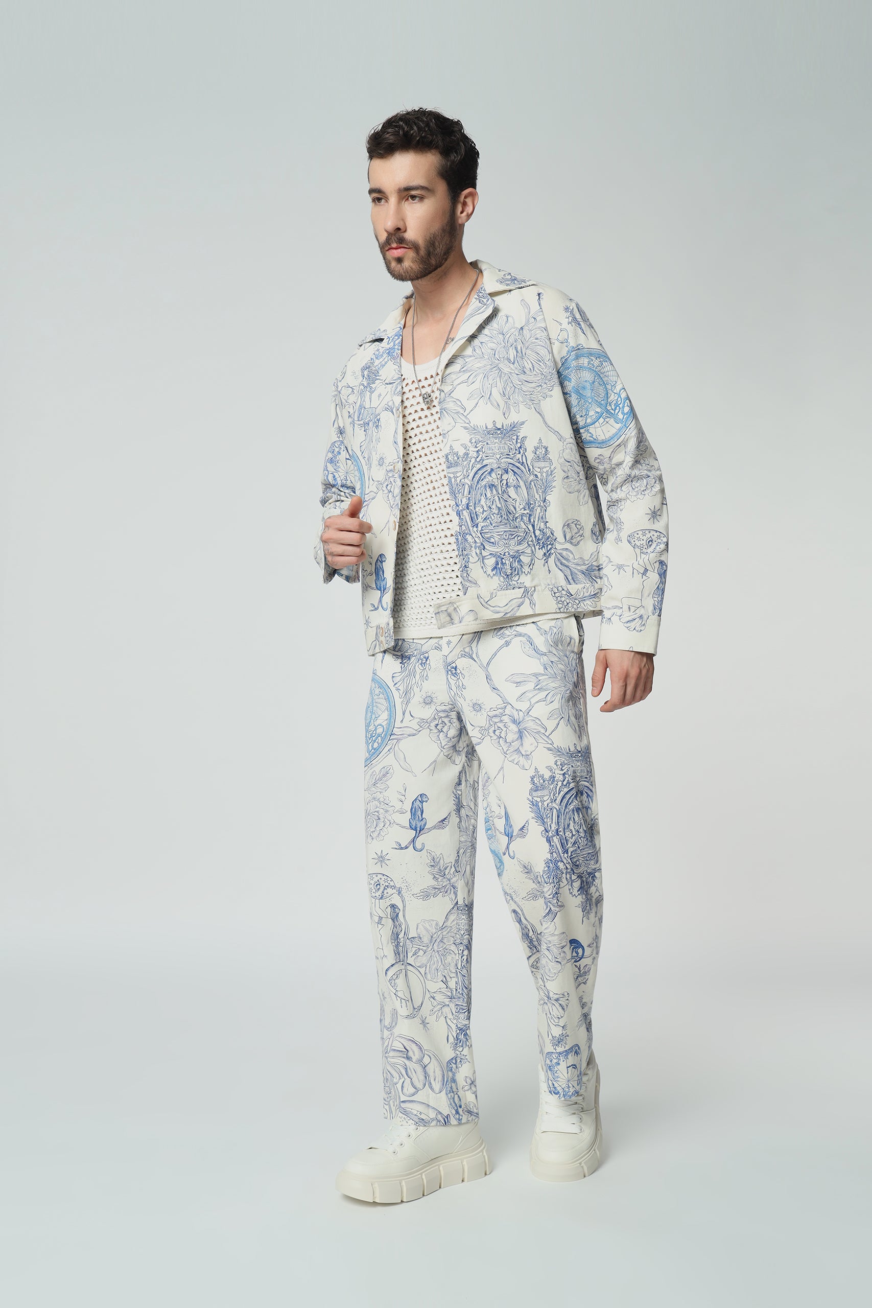 “Complete the ensemble with our matching toile de Jouy pants. Embrace coordinated elegance with this stylish pairing, perfect for making a statement with timeless flair.”