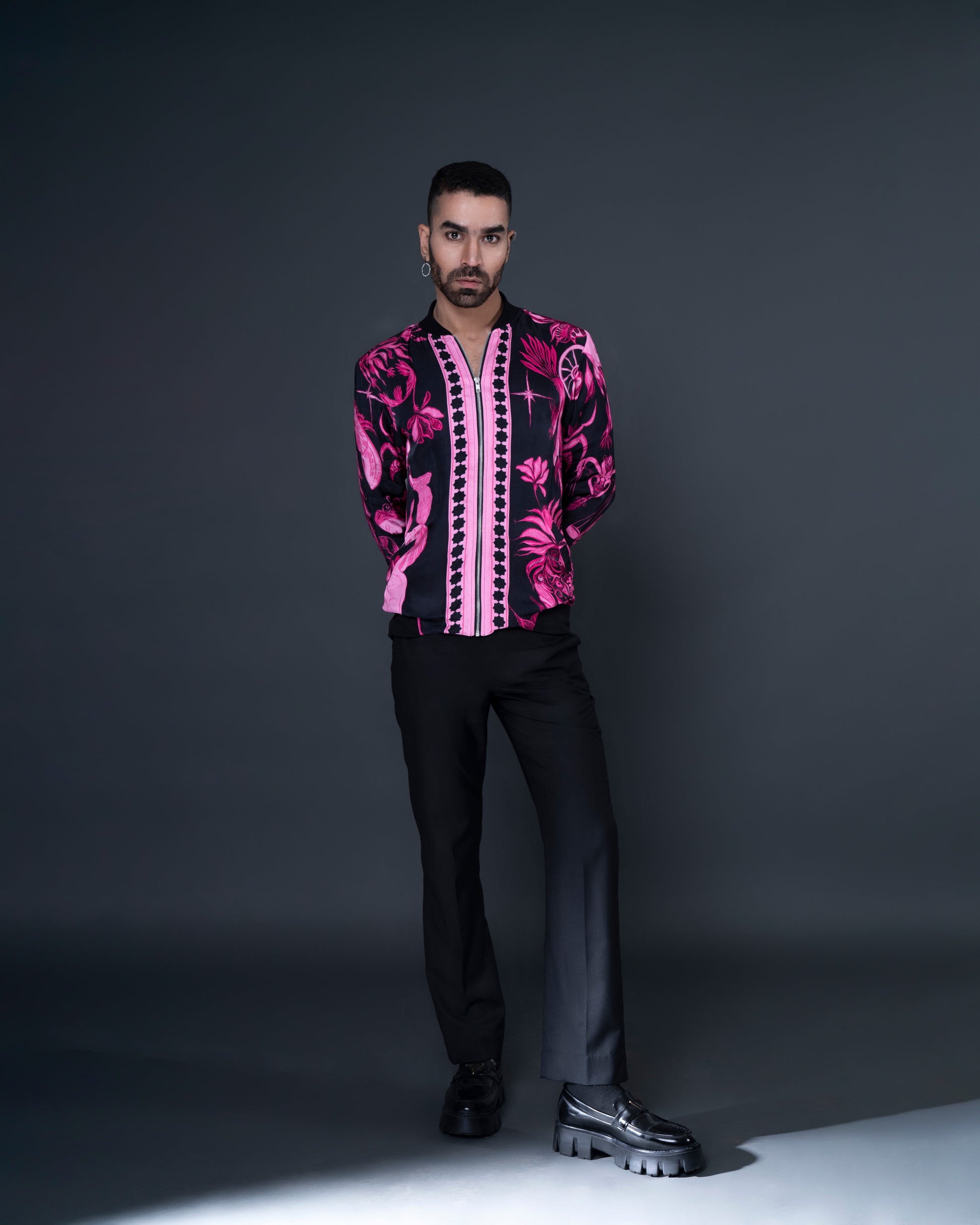 A bomber jacket inspired by the zodiacs digitally printed on fine quality viscose satin twill fabric with a relaxed fit, comes with a celestial and elegant touch to any wardrobe. It’s a stylish way to showcase your astrological affinity!