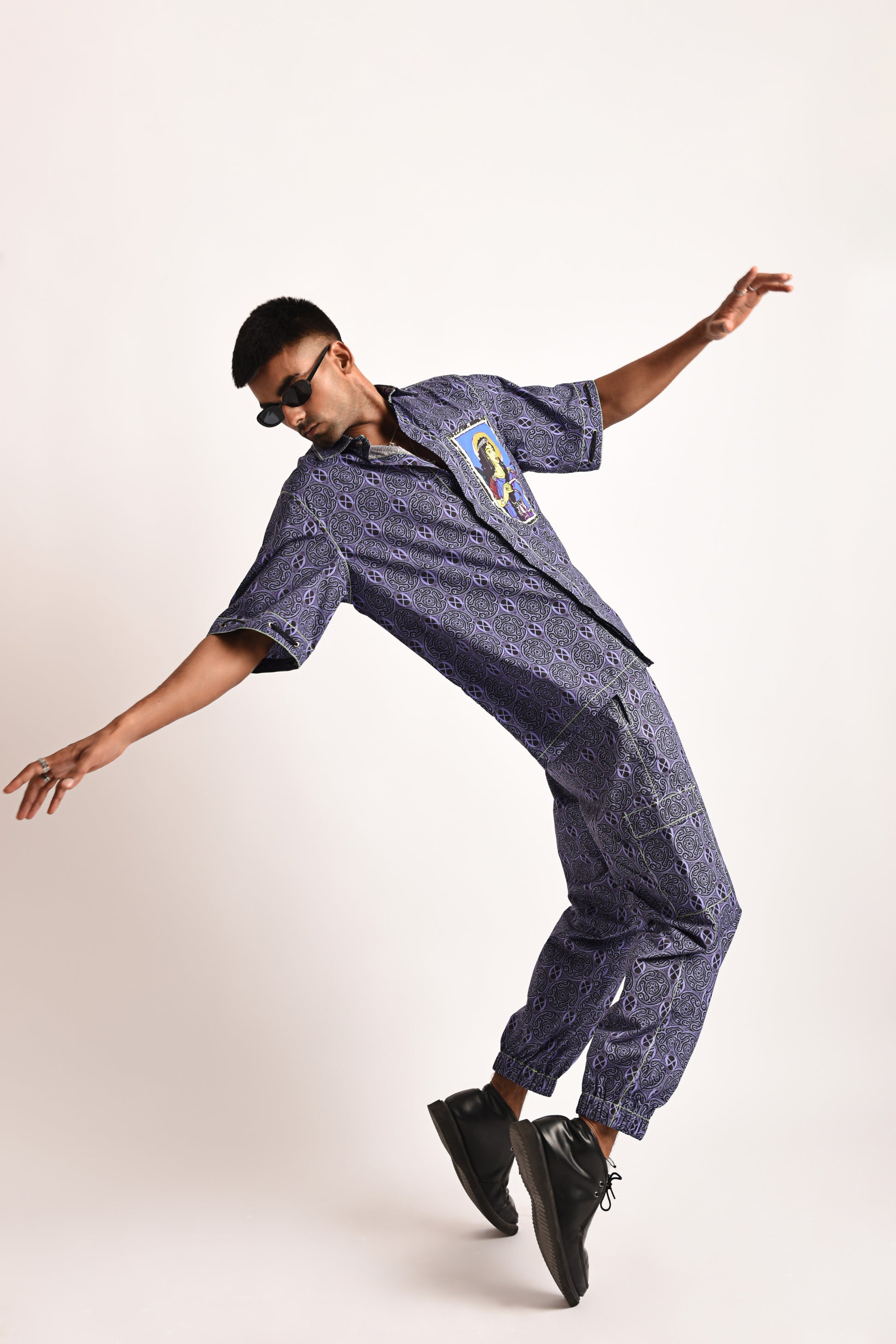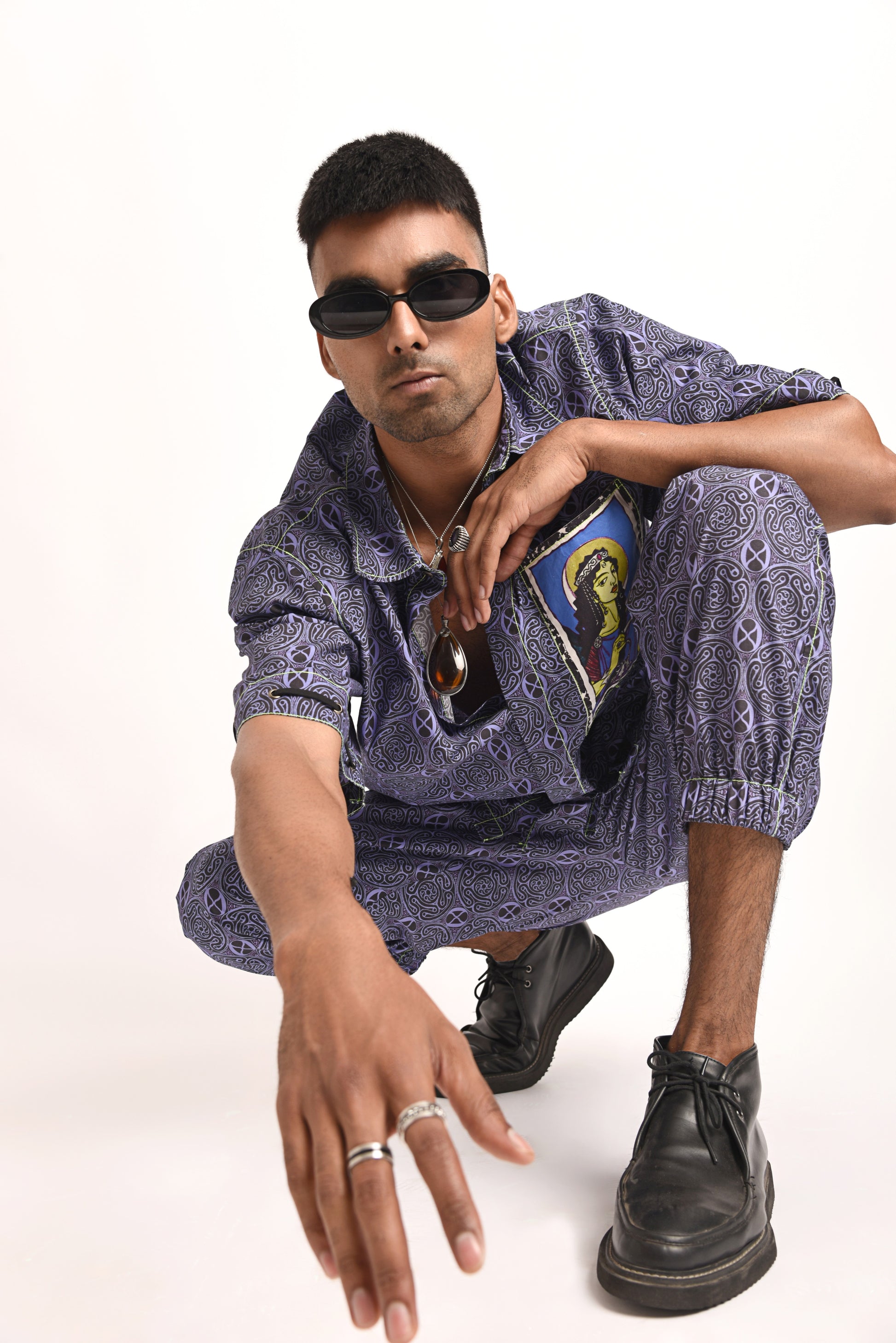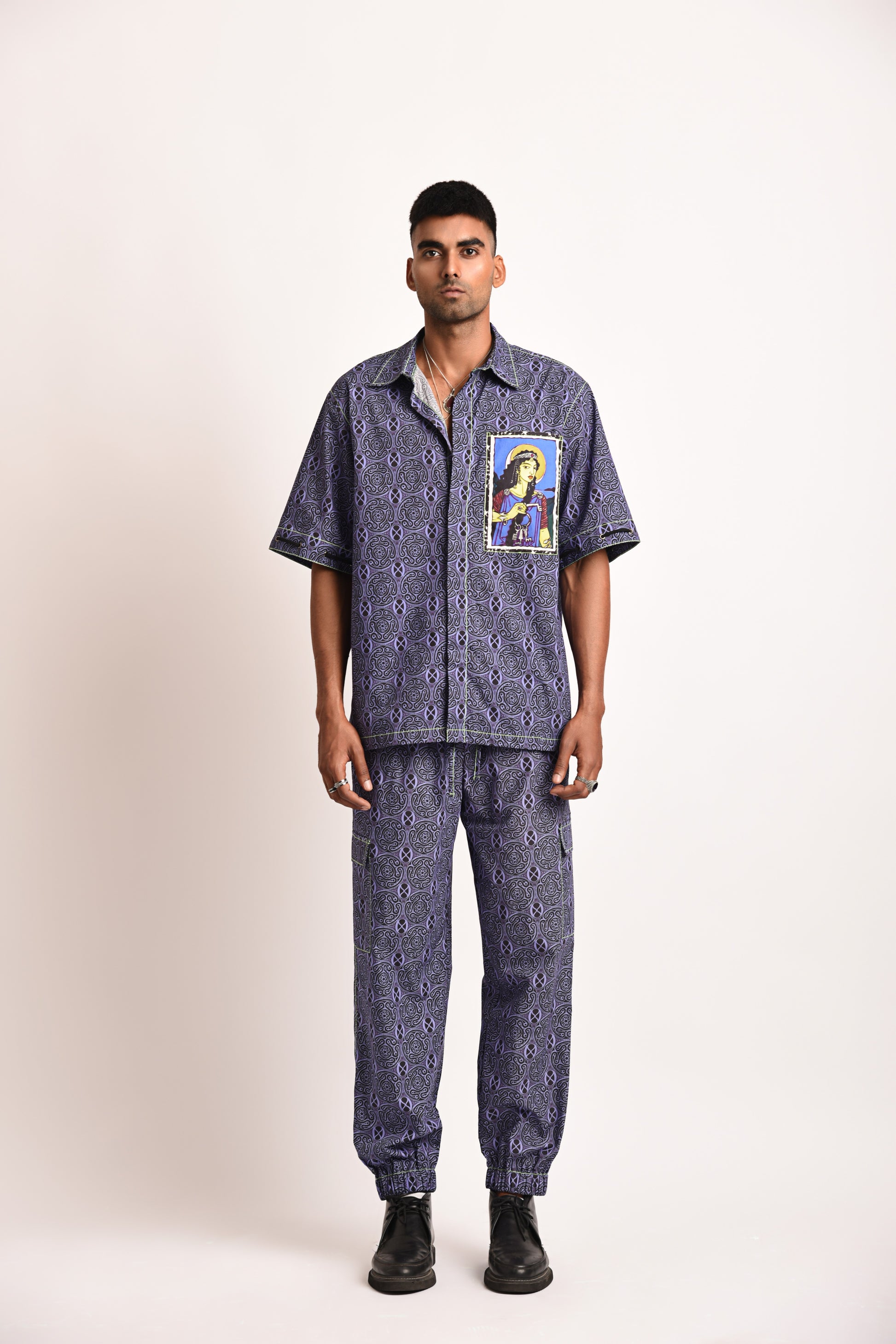Trivia Shirt: Digitally printed on 100% cotton fabric with a structured fit, gun metal eyelet details on sleeves, goddess hecate illustration patch pocket, concealed placket, metal buttons with the iconic fluorescent green stitching.